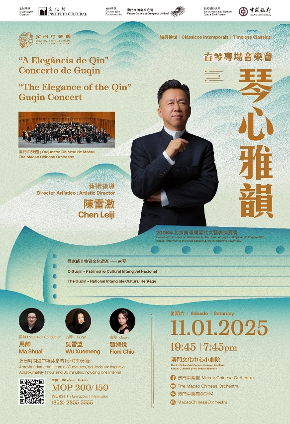 由文化局舉辦的澳門中樂團2024-25樂季節目古琴專場音樂會《琴心雅韻》,將於1月11日(周六)晚上7時45分在澳門文化中心小劇院上演。當代古琴藝術領軍人物陳雷激親臨澳門,擔任藝術指導及古琴演奏,親自獻演多首古琴名曲,更呈獻兩首為本場音樂會全新創作的古琴獨奏及協奏曲,在音樂會中作世界首演。