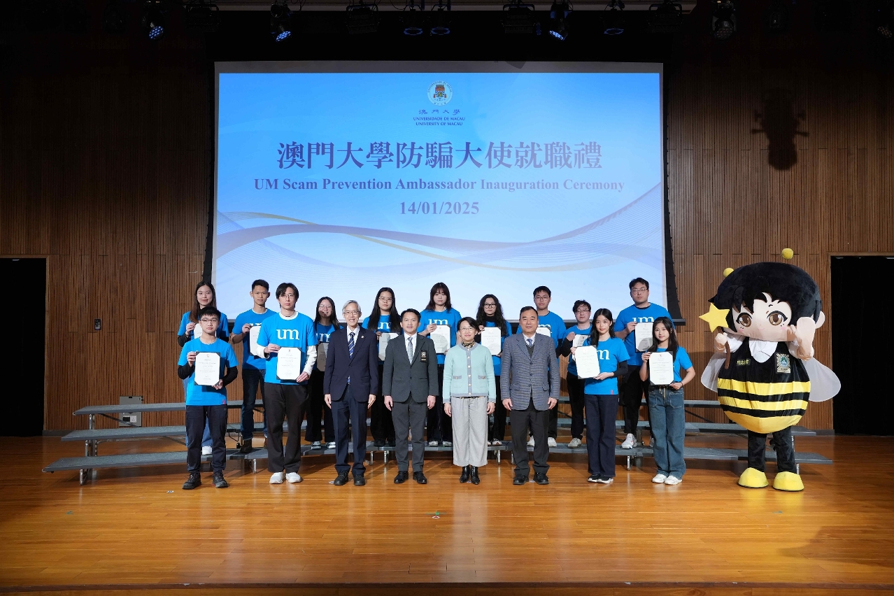 澳門大學積極響應澳門特別行政區司法警察局和教育及青年發展局的“校園防騙疫苗計劃”,致力在校園宣傳防騙資訊,增強學生的防騙意識,並於今(14)日委任超過440名學生領袖擔任第一屆防騙大使。他們分別來自澳大十所住宿式書院、研究生宿舍小導師計劃、澳大學生會及司法警察局“社區安全青年領袖計劃”。典禮上,澳大副校長徐建和司法警察局副局長蘇兆強先後向防騙大使代表頒發委任狀。