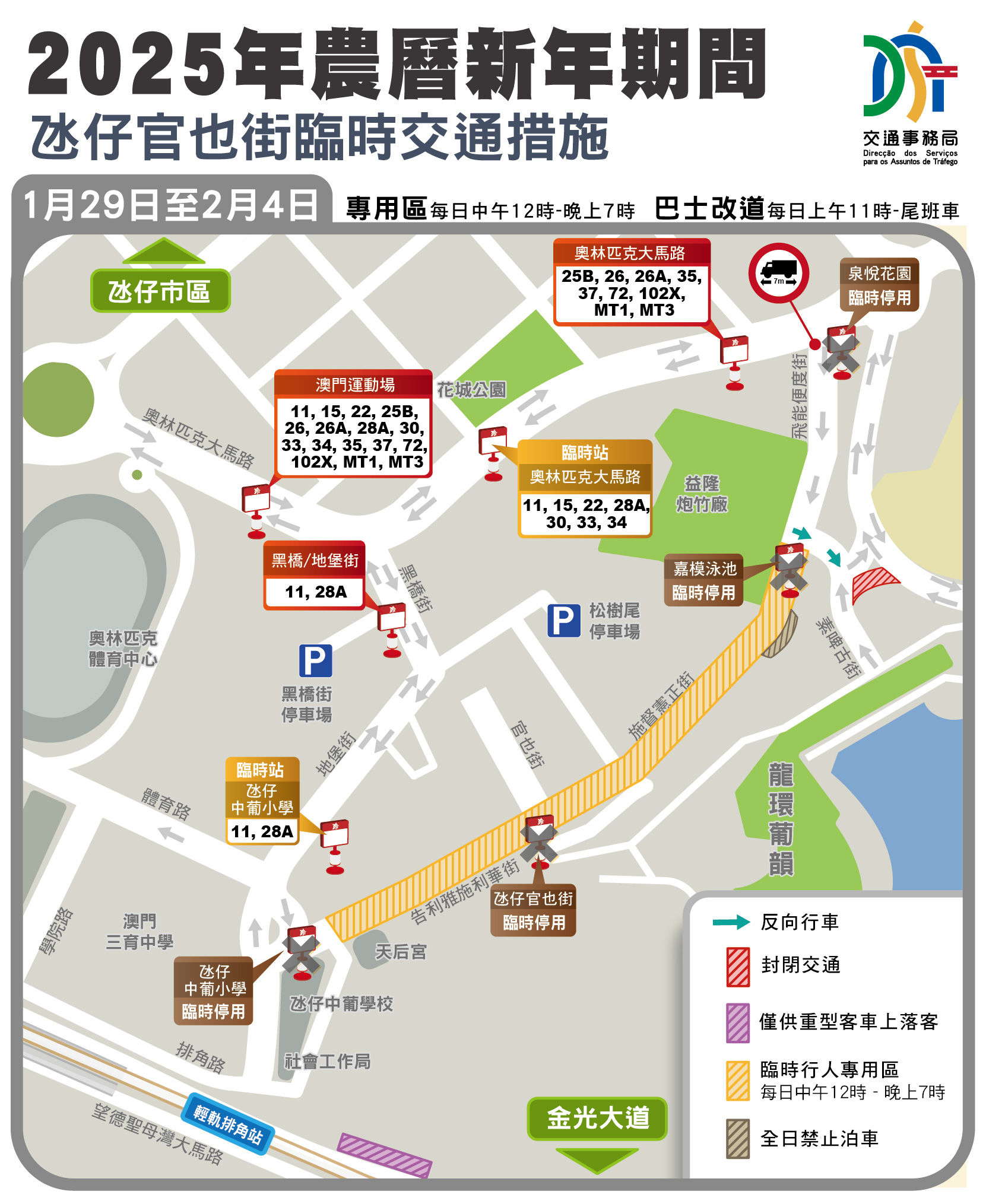 備註:氹仔舊城區臨時行人專用區計劃、新春花車巡遊及煙花匯演等活動相關的臨時調整可留意交通事務局網頁公佈。