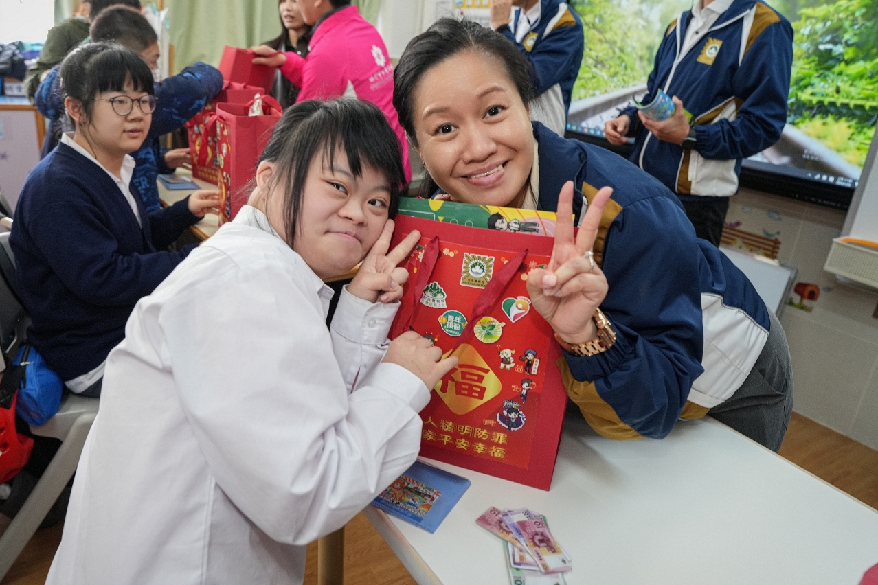 為弘揚關愛共融和奉獻精神,並向社會大眾傳遞支持與關懷復康人士的正面訊息,司法警察局聯同“大廈防罪之友"和“婦女防罪之友"成員、“社區安全青年領袖計劃"及“滅罪小先鋒種子計劃"(下稱“兩項青年計劃")學員前往明愛學校探訪學童,送上新春福包和節日祝福,祝願他們新年快樂,健康成長。