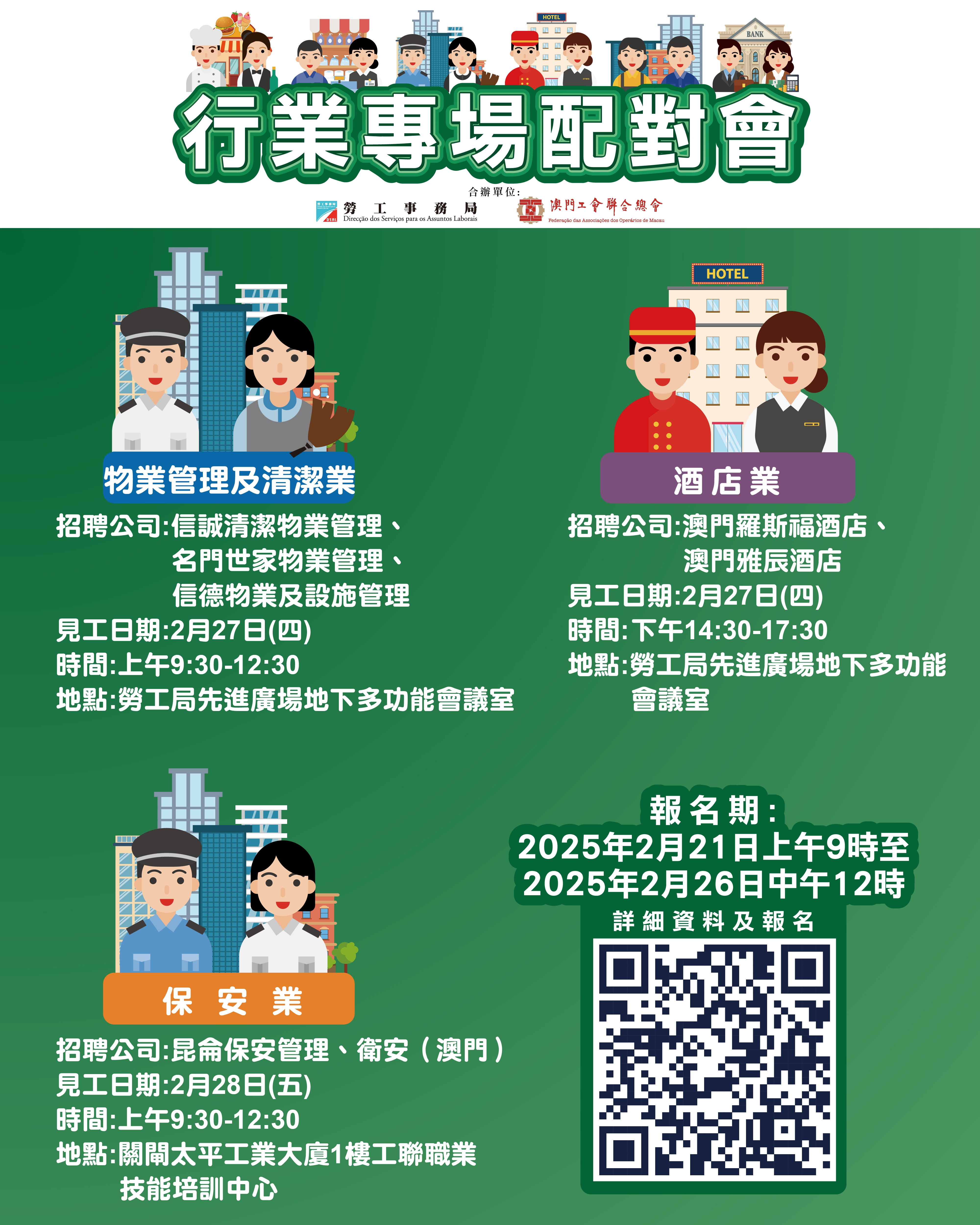 2月27日上午物管及清潔業專場配對會和下午酒店業專場配對會在澳門勞工事務局地下多功能會議室(澳門馬揸度博士大馬路221-279號先進廣場大廈)舉行;2月28日上午保安業專場配對會在澳門工聯職業技能培訓中心(關閘馬路101-105A號太平工業大廈第一期1樓)舉行。報名日期為2月21日上午9時至2月26日中午12時。