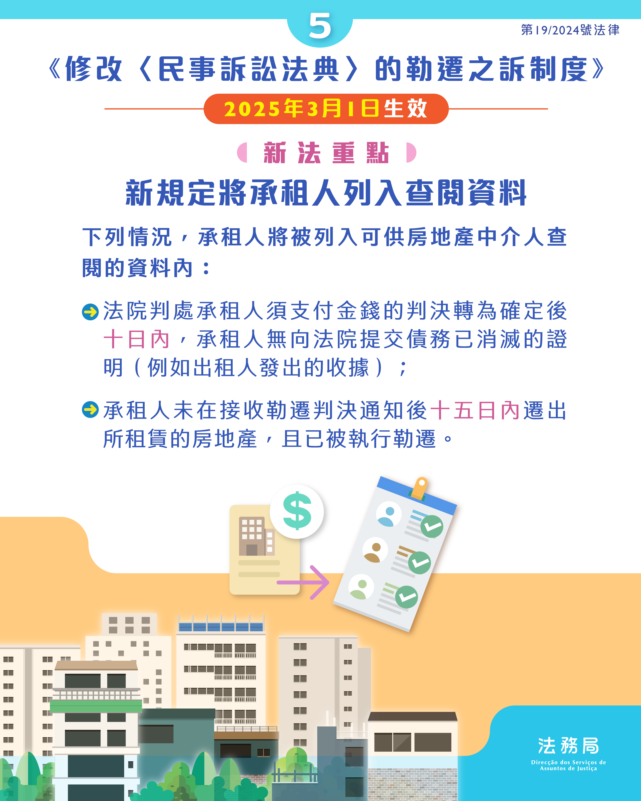 “新勒遷制度”新增下列情況下,承租人將被列入可供房地產中介人查閱的資料內,包括:法院判處承租人須支付金錢的判決轉為確定後十日內,承租人無向法院提交債務已消滅的證明;承租人未在接收勒遷判決通知後十五日內遷出所租賃的房地產,且已被執行勒遷。