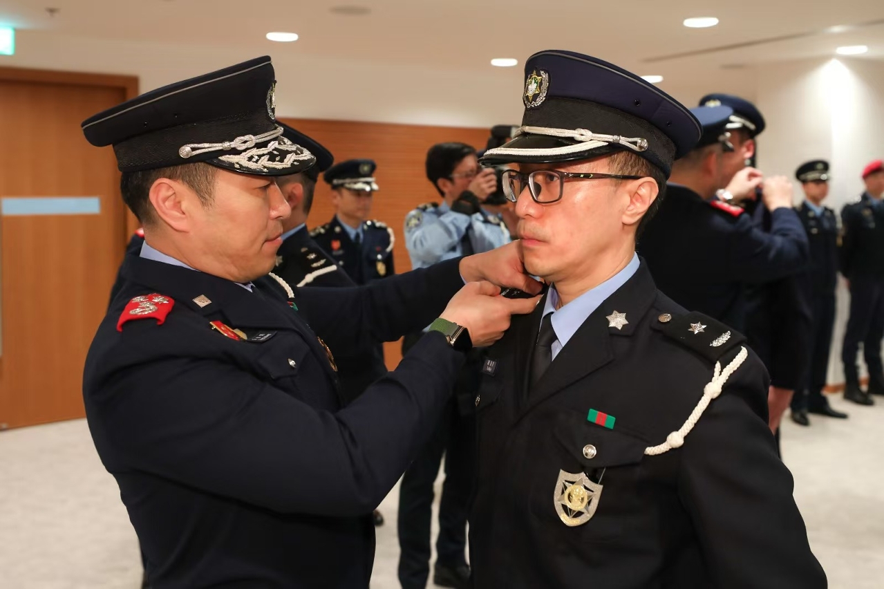 今(28)日上午,治安警察局在總部大樓舉行警長晉升儀式,儀式由吳錦華局長主持,黃偉鴻副局長、梁慶康副局長、伍素萍副局長及各部門主管出席儀式。儀式上,各位晉升的警長正式戴上新的肩章,標誌着晉升人員肩負起更大的責任與使命。