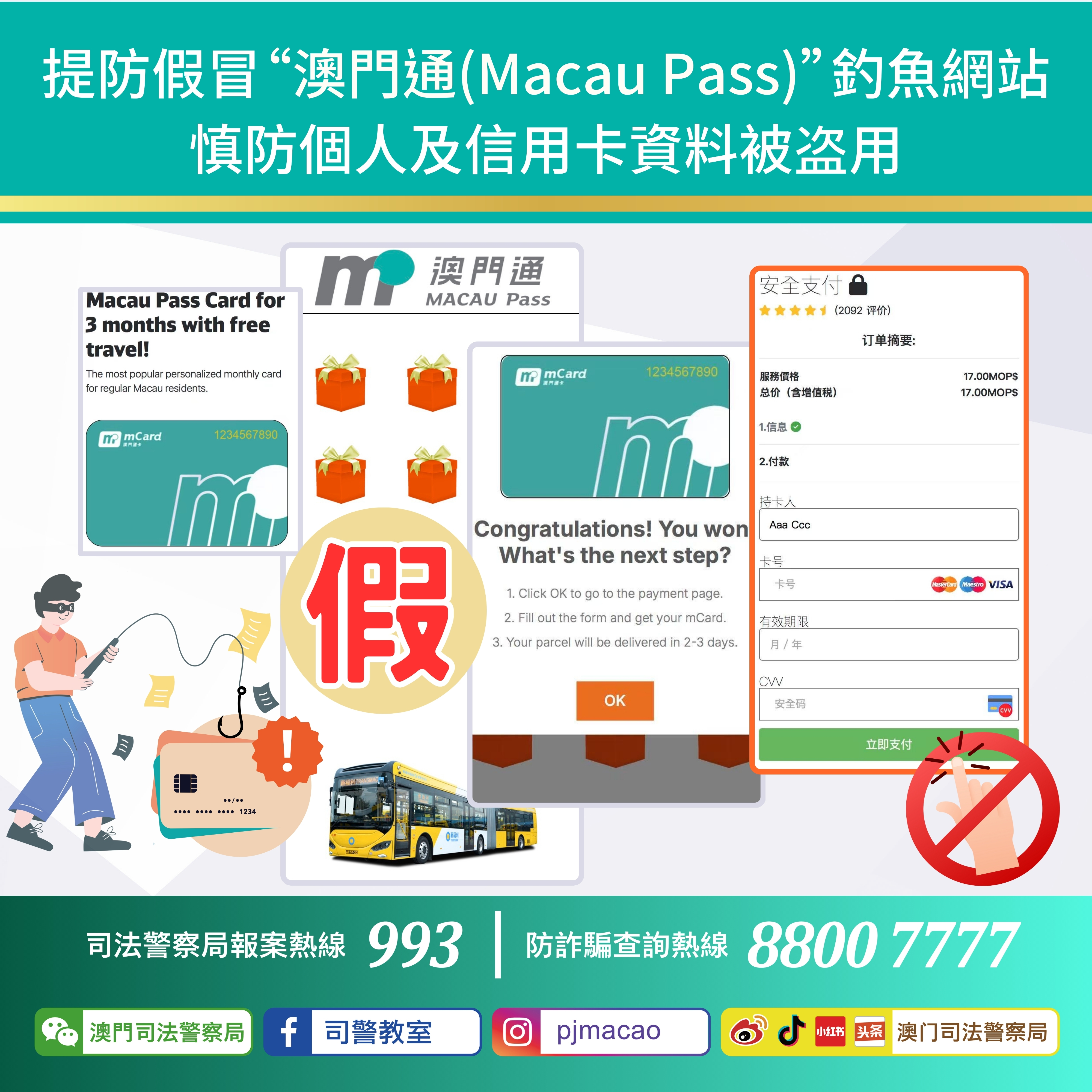 近日,司法警察局發現有人在社交平台Facebook上假冒“澳門通”名義發佈虛假訊息。該訊息以英文撰寫,謊稱“澳門通”推出一項旨在改善流動性及促進公共交通的計劃,有意參與者只需支付17澳門元即可獲得一張可於三個月內無限次乘搭本澳公共交通工具的澳門通卡。
