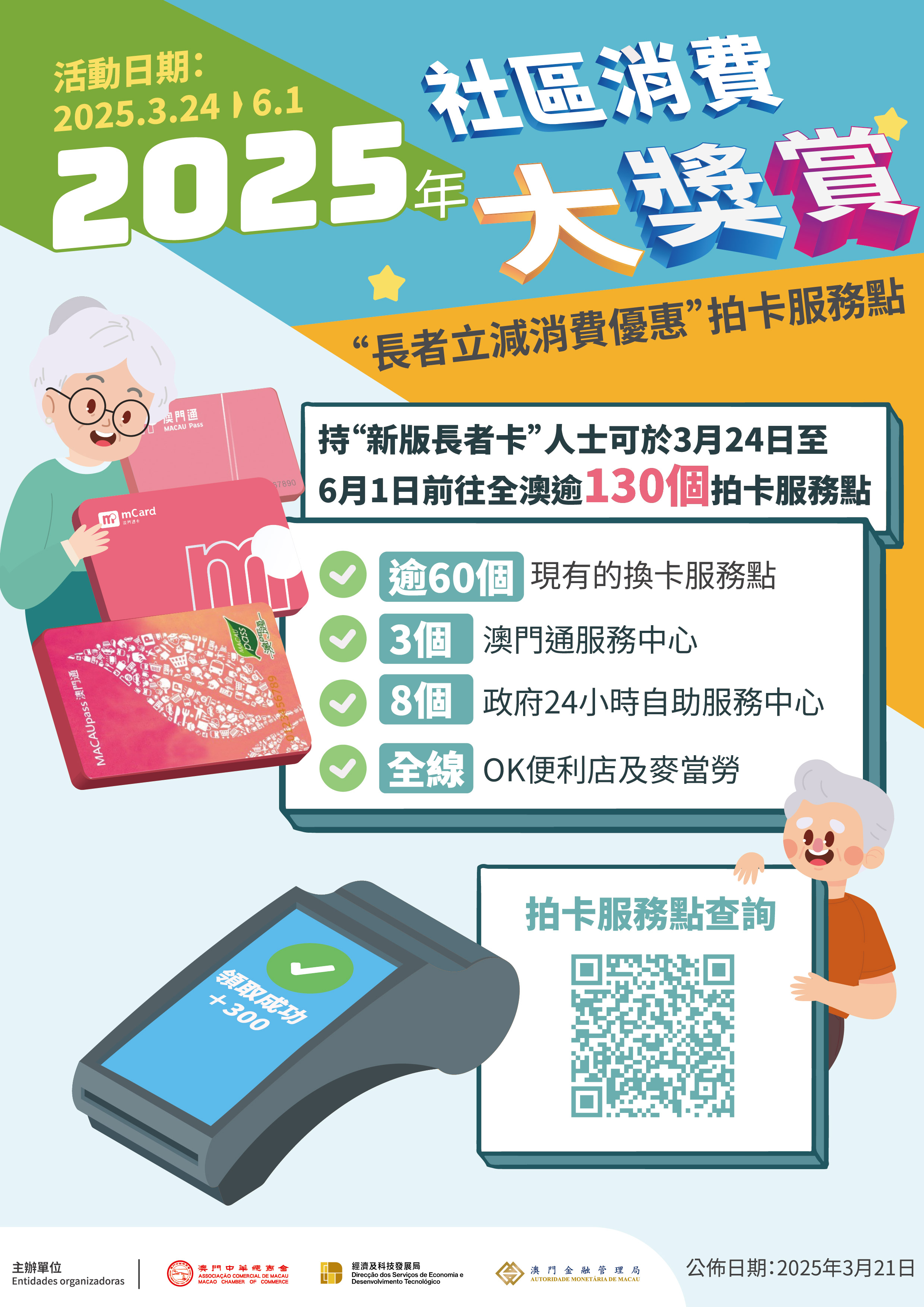 持有新版“長者卡”的巿民,可於3月24日至6月1日活動期間,持卡前往全澳逾130個指定服務點,拍卡領取立減優惠。