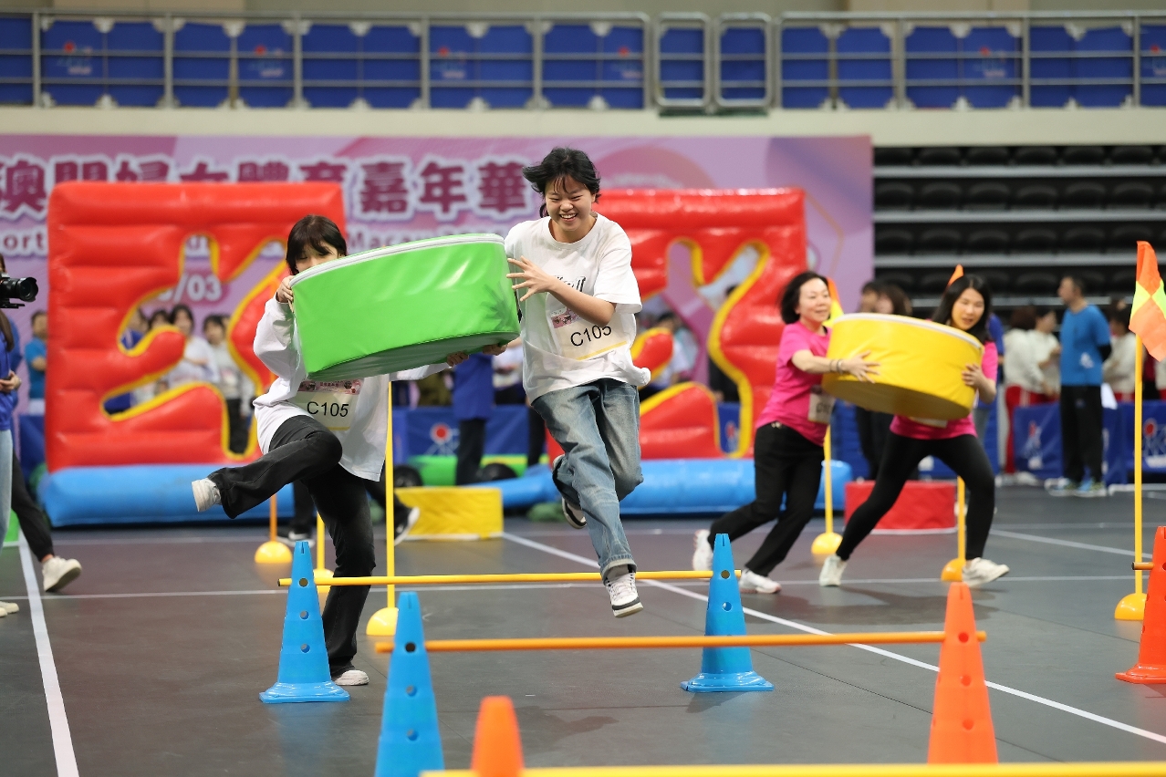 康體競技活動則於今(23)日上午9時在塔石體育館壓軸上演,比賽分兩回合進行,大灣區城市及橫琴合作區亦派出隊伍參與友誼賽,同場較勁爭奪各項殊榮。為迎接年第十五屆全國運動會的舉辦,當日競賽項目亦加入相關元素,包括:羽毛球、乒乓球、排球及籃球,過程緊張刺激,各隊伍發揮團隊合作精神,同心合力,順利過關。現場亦設置婦女健康諮詢服務,為參加者提供相關婦女健康知識。各地婦女們透過本活動交流體育文化,共同分享運動帶來的喜悅。