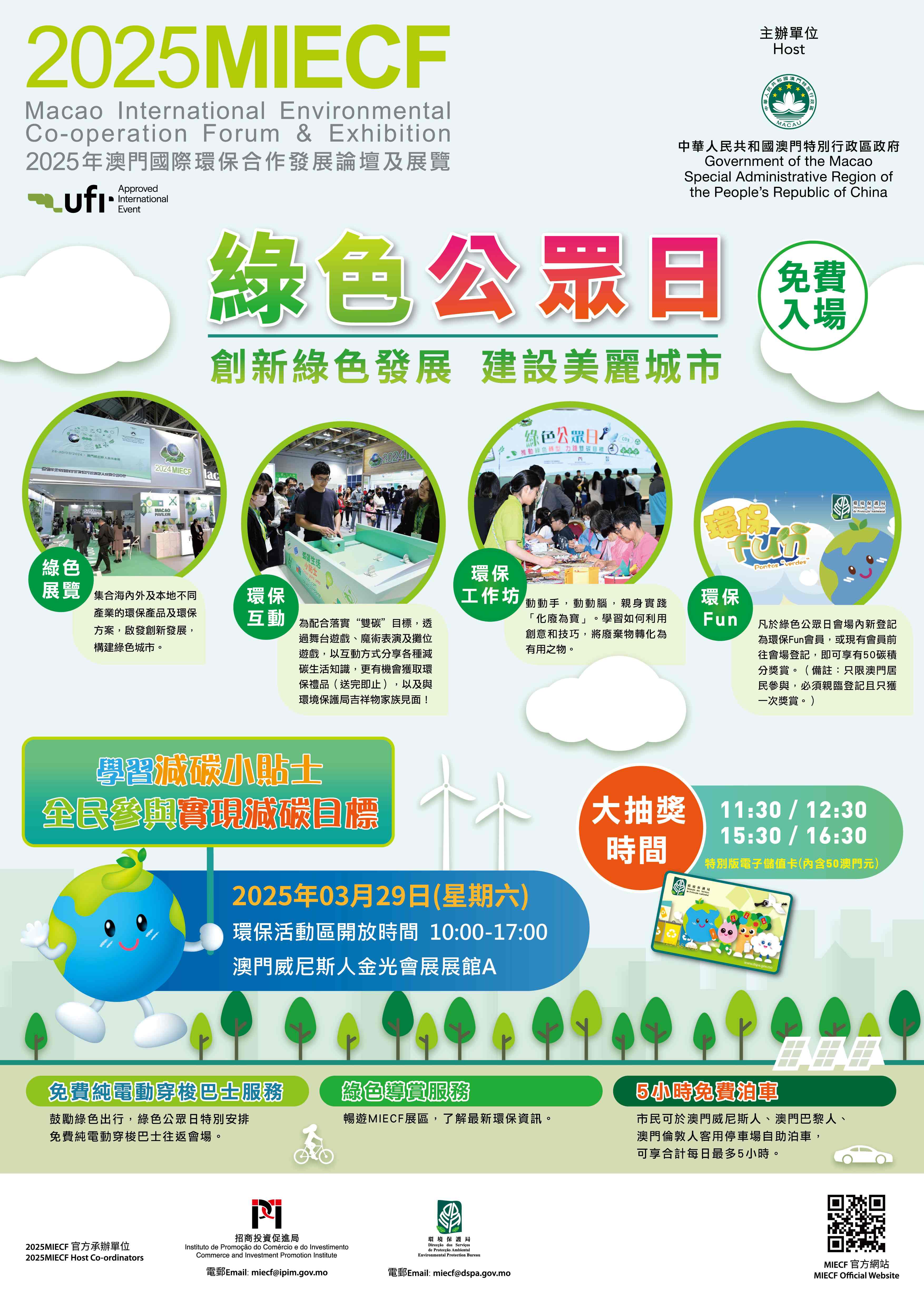 由澳門特別行政區政府主辦的“2025年澳門國際環保合作發展論壇及展覽”(2025MIECF)將於3月27日至29日假澳門威尼斯人金光會展舉行。圍繞“創新綠色發展 建設美麗城市”的主題,大會將最後一日(3月29日)定為“綠色公眾日”,公眾可免費入場參觀綠色展覽,了解最新環保資訊和技術。大會並透過在現場舉辦系列環保宣教活動,向公眾傳遞綠色生活理念,共建綠色可持續發展未來。