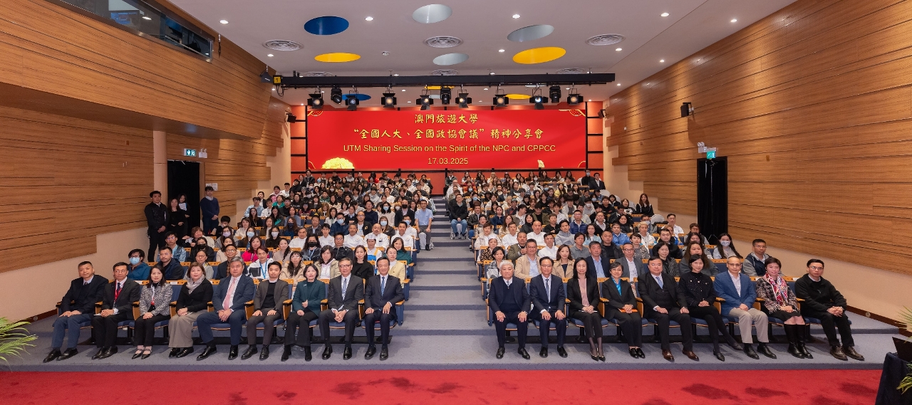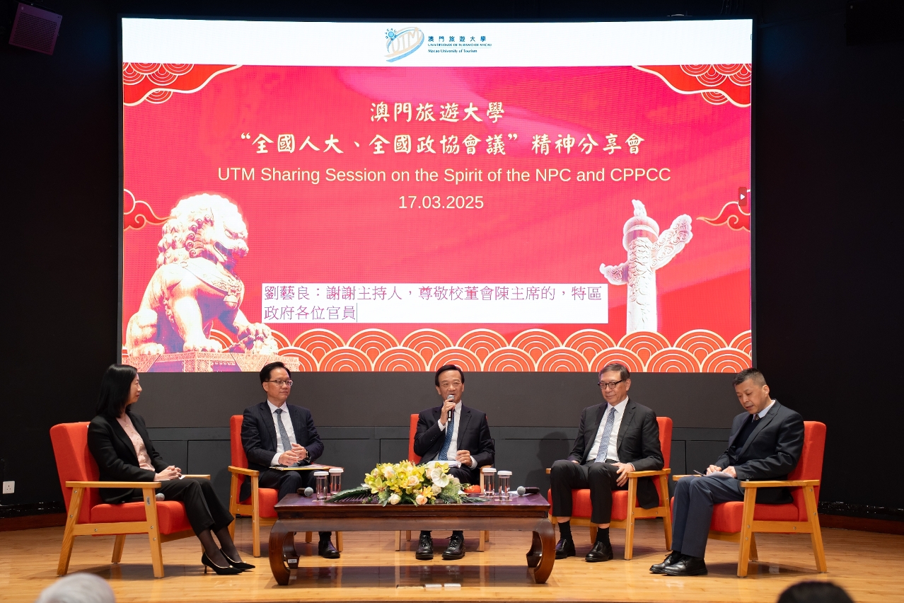 澳門旅遊大學在3月17日舉行“全國人大、全國政協會議”精神分享會,邀請澳區全國人大代表團團長、澳門歸僑總會永遠會長劉藝良,全國政協委員、澳門立法會議員高錦輝,全國政協委員、澳門旅遊大學發展基金會信託委員會主席及校董會副主席呂耀東,以及全國政協委員、澳門旅遊大學校長黃竹君擔任主講嘉賓。四位嘉賓圍繞“兩會”熱點話題展開深入分享,鼓勵學生肩負起新時代“一國兩制”實踐的重要使命,積極融入國家發展大局,並努力講好“中國故事”。
