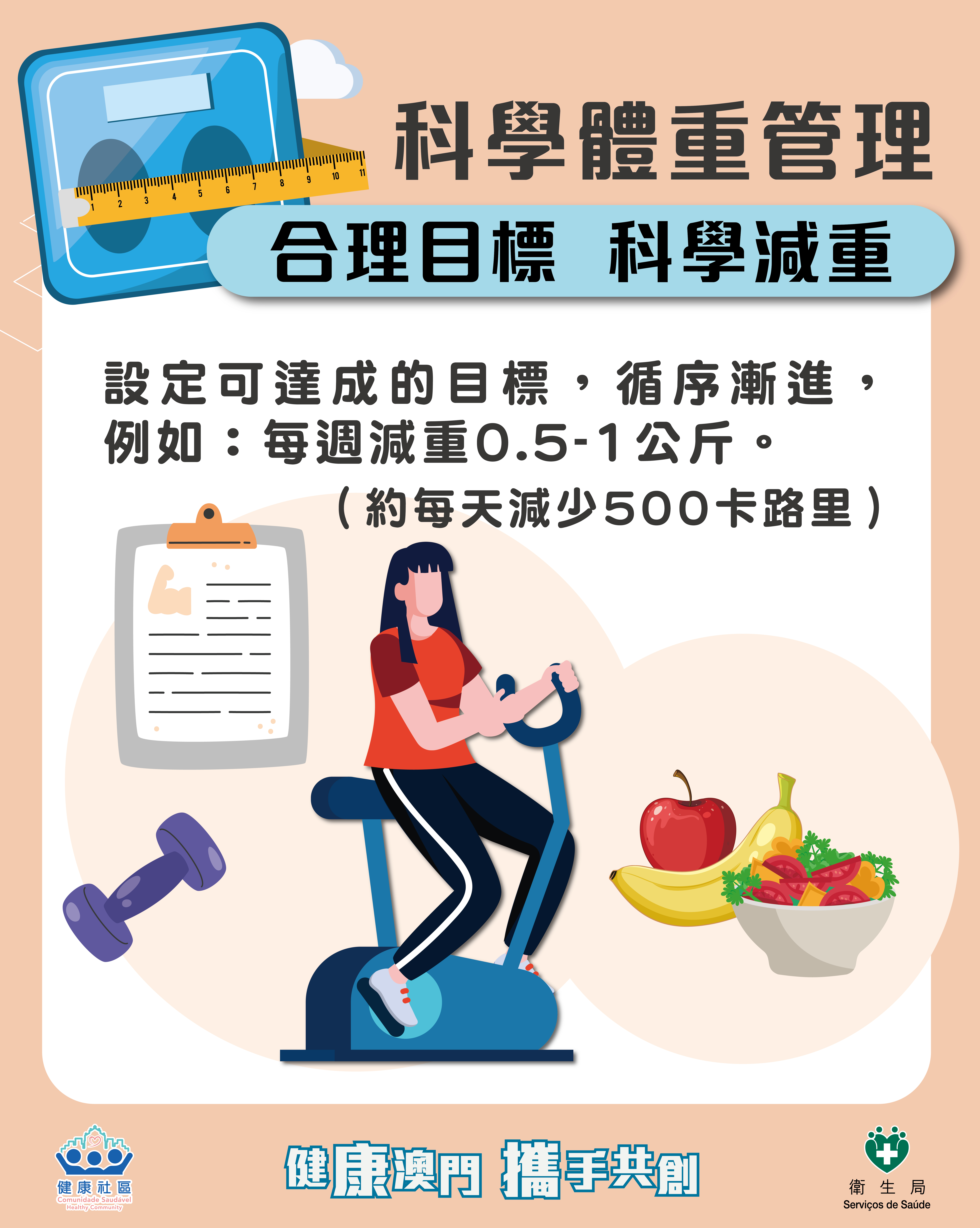 超重及肥胖與高血壓、高血糖、高血脂等慢性病密切相關,是導致心腦血管疾病、糖尿病及部分癌症的重要風險因素。超重及肥胖對各年齡層人士的身心健康均可造成深遠影響,包括兒童期會引起早發性高血壓、孕期併發症風險增加,以及成年人慢性病發病率上升等。故此,需提升居民體重管理意識和技能,預防和控制超重肥胖。衛生局提出科學體重管理4大核心要點:定期測量,記錄評估、均衡飲食,動則有益、緩減壓力,規律作息、合理目標,科學減重。衛生局建議18歲或以上人士至少每年測量一次體重並計算體重指數(BMI),定期記錄健康數據;應均衡飲食,善用碎片時間進行運動;保持睡眠充足,盡量緩減壓力;設定可達成的目標,循序漸進,例如:每週減重0.5-1公斤,避免極端方式(請參閱“科學體重管理圖文包”)。