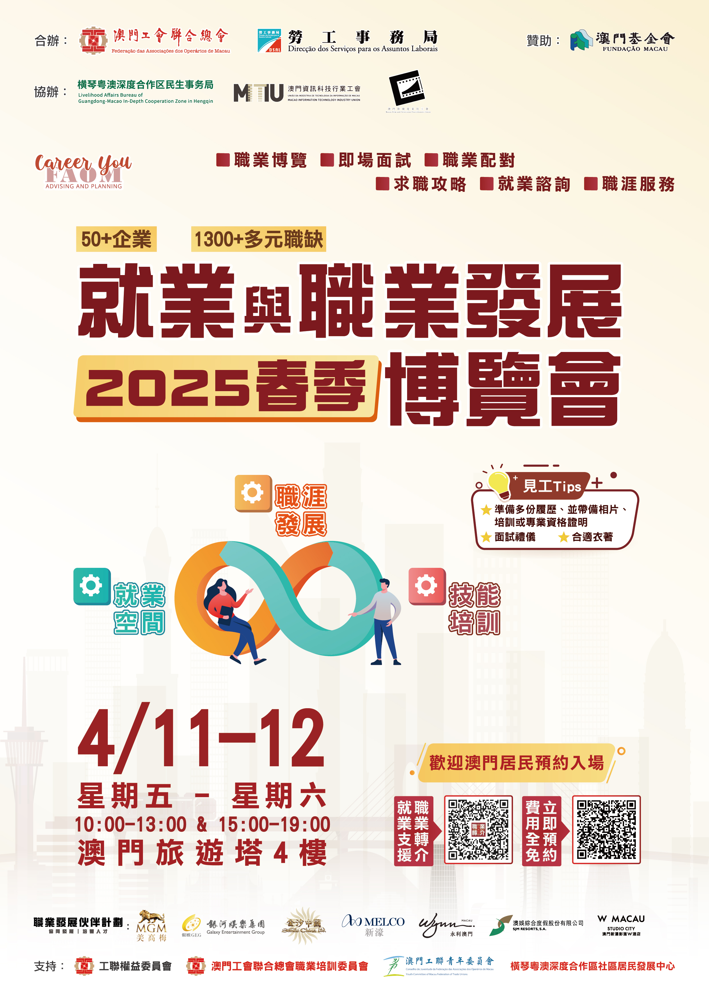 為進一步促進居民就業,勞工事務局與澳門工會聯合總會將於4月11日至12日合辦“2025春季就業與職業發展博覽會”(下稱博覽會),提供逾1,300個空缺。有意參加的澳門居民可於3月31日起至4月10日中午12時進行網上預約。