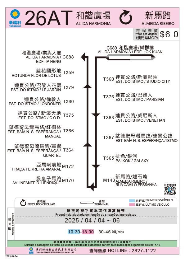 因應內地清明節假日連假,為疏導客流,交通事務局提前協調兩巴在關閘廣場、路氹城一帶、媽閣交通樞紐及港珠澳大橋口岸實施時節性的巴士服務安排,兩巴於4月4日至6日指定時段營運時節性路線17T、21AT、26AT及101X特班車(101XS)路線(具體營運資料可查閱附圖),亦會派員到主要站點,維持秩序和指引乘客。此外,局方亦協調港澳跨境巴士於清明節期間加密班次,應對客流。