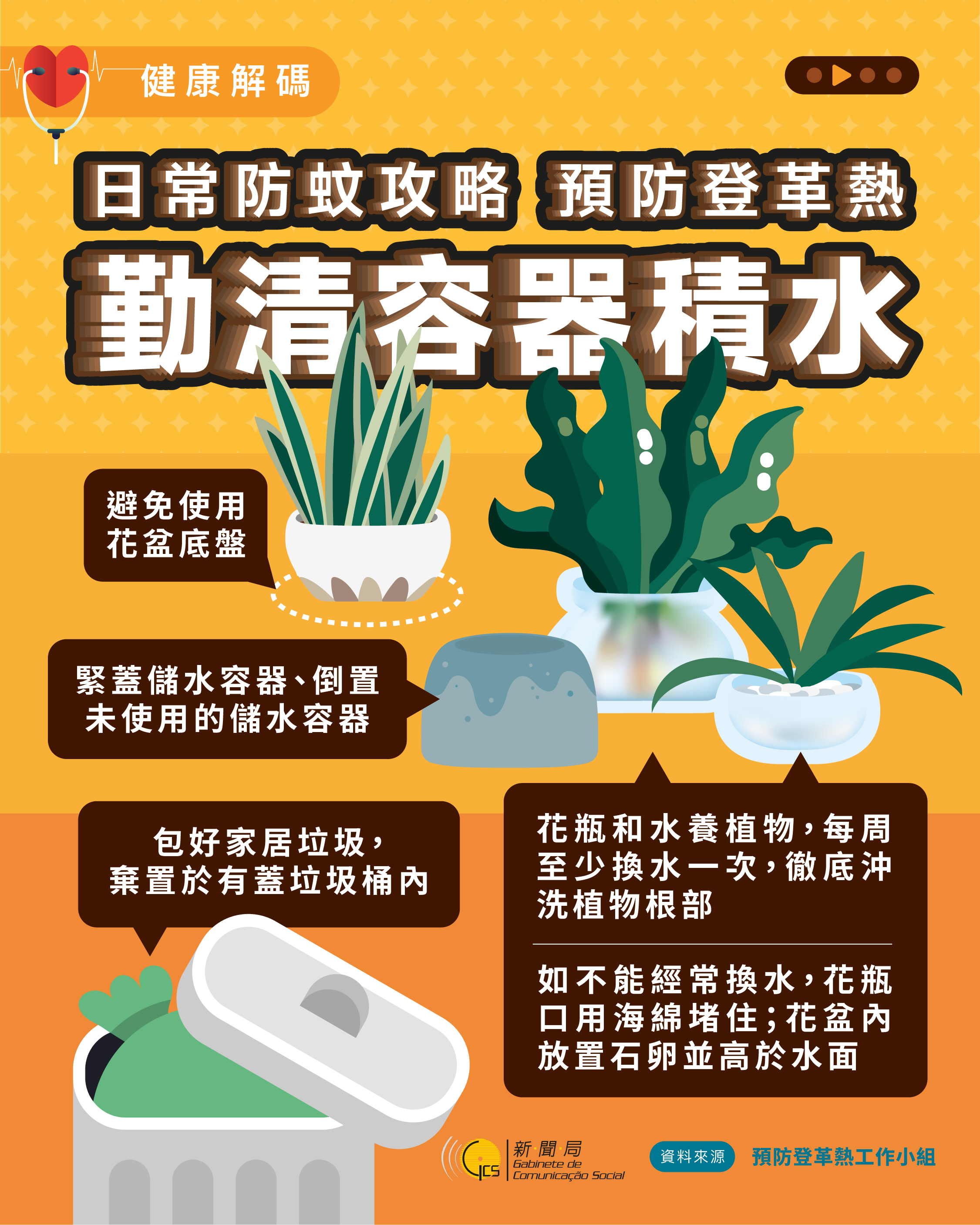 工作小組將持續密切留意澳門鄰近地區的登革熱流行情況,以作充分應對準備。基於今年登革熱傳播風險較高,工作小組已制定一系列巡查孳生源及滅蚊等工作,並以深入社區的活動方式向市民宣傳預防登革熱的訊息,冀共同做好環境清潔及個人防蚊措施,攜手預防登革熱。