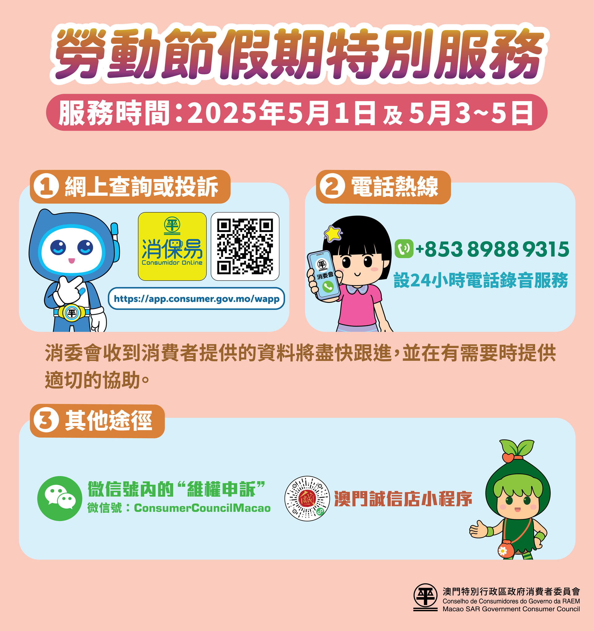消費者委員會配合“五‧一”勞動節假期,於明(5月1日)天以及5月3日至5日設假期特別服務,為消費者提供查詢或投訴服務。