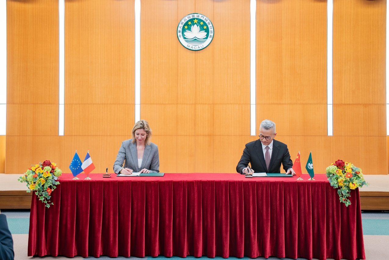 經濟財政司司長戴建業代表特區政府與法國政府代表法國駐香港總領事館總領事杜麗緹於5月8日在澳門簽署了《中華人民共和國澳門特別行政區政府和法蘭西共和國政府有關執行科研合作計劃的協議》。該協議旨在加強雙方在科研領域的交流與合作,促進科技創新和人才培養,是澳門著力打造更高水平對外開放平台的重要進展。外交公署副特派員孫向陽出席,以及高校、科技企業、法國及歐洲商會等機構代表近40人出席簽署儀式。