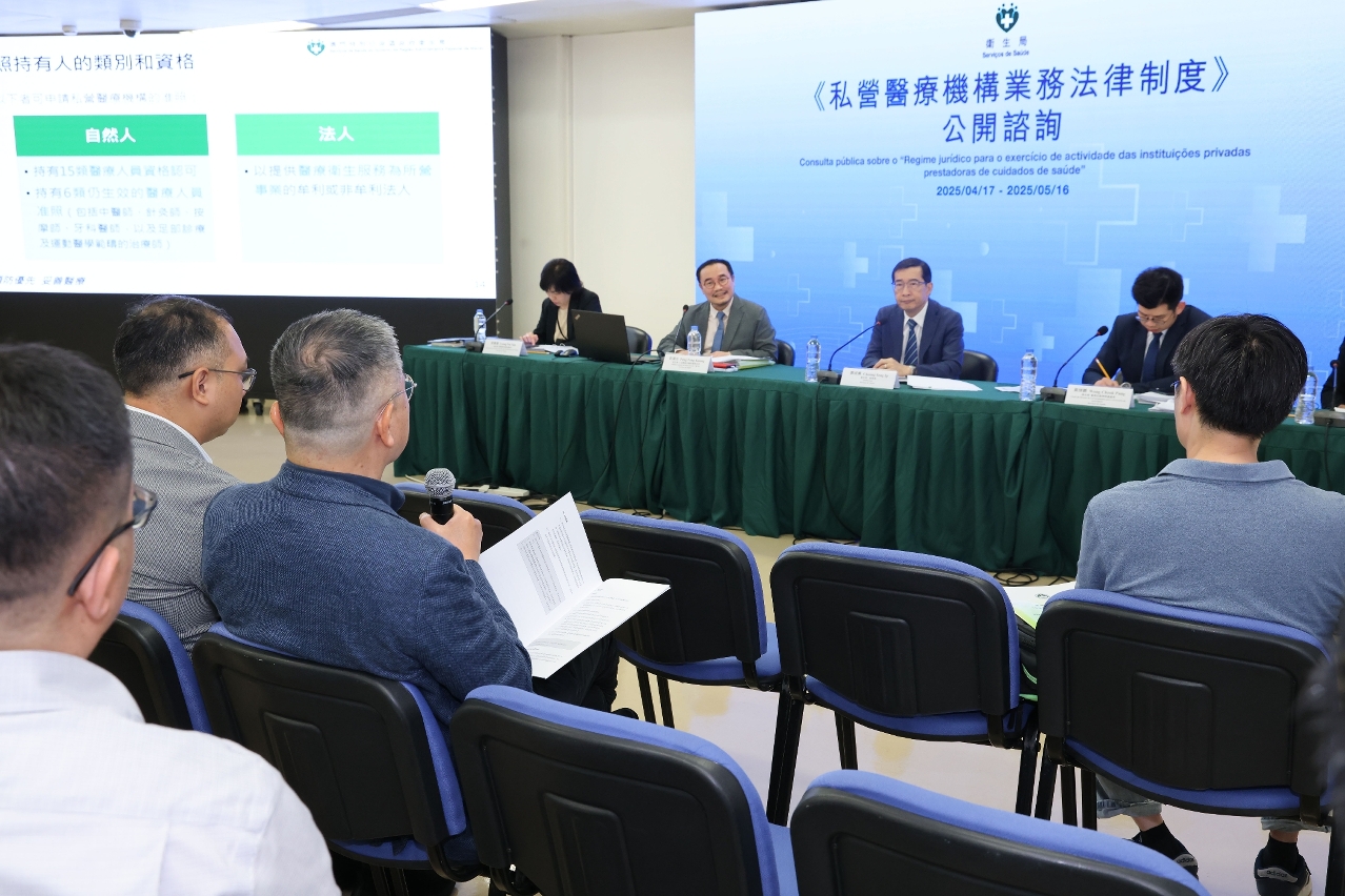 鄭成業副局長表示,特區政府計劃優化現行制度,進一步拓展本澳醫療市場的發展空間,為本澳醫療人員創造更多發展機會,向居民、旅客提供多元化和優質的醫療服務,在推動本澳大健康產業發展同時,也能有效地保障公眾健康。彭蓬光醫務主任則詳細介紹了《私營醫療機構業務法律制度》公開諮詢的主要內容,包括牌照制度設計、機構的開設及運作要求、法律規範的醫療服務、處罰制度及過渡安排等。