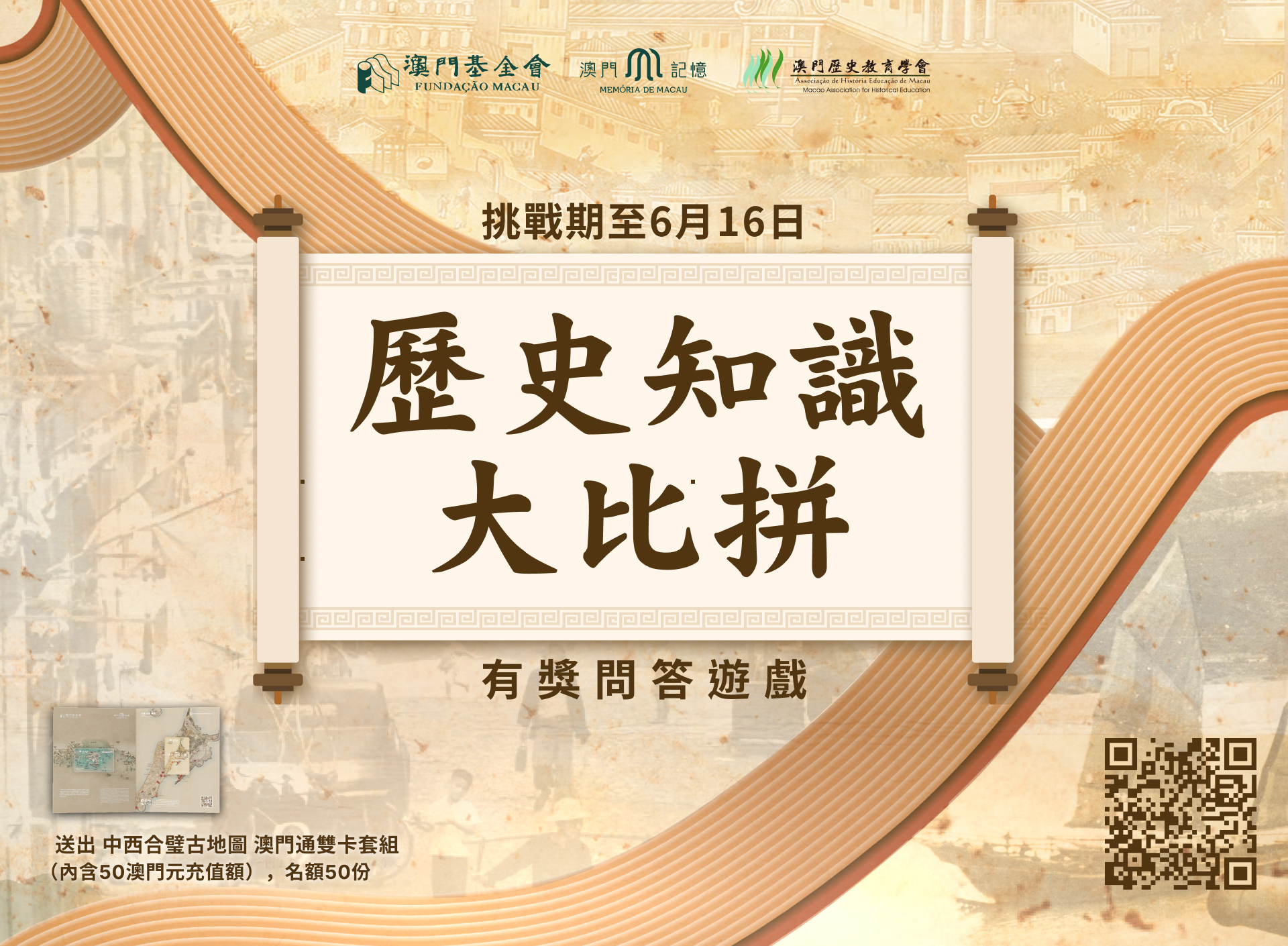 由澳門基金會及其歷史文化工作委員會、澳門歷史教育學會與澳門廣播電視股份有限公司聯合主辦,教育及青年發展局和文化局支持的第六屆“澳門中學生歷史知識競賽”決賽將於2025年5月18日(星期日)假濠江中學附屬英才學校舉行。為配合此次賽事的舉行,並進一步提升市民對中華歷史文化的興趣、增強對本地歷史的了解,以及推廣歷史文化教育,澳門基金會與澳門歷史教育學會攜手在“澳門記憶”文史網推出“歷史知識大比拼”有獎線上問答遊戲。