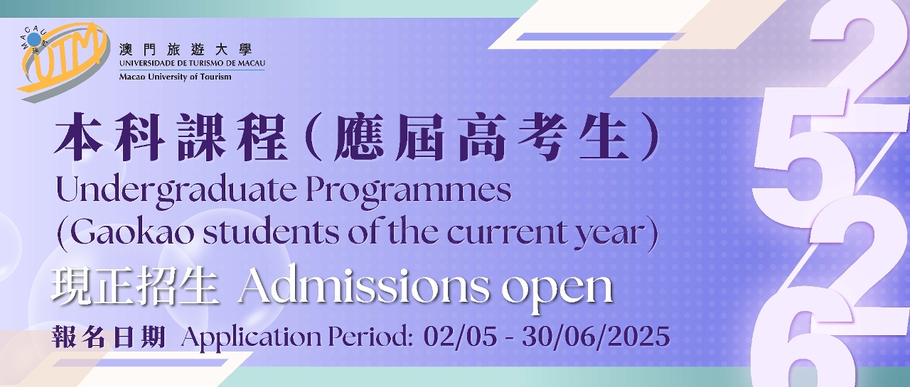 澳門旅遊大學於即日起正式接受應屆高考生報讀2025/2026學年學士學位課程,報名截止日期為2025年6月30日。