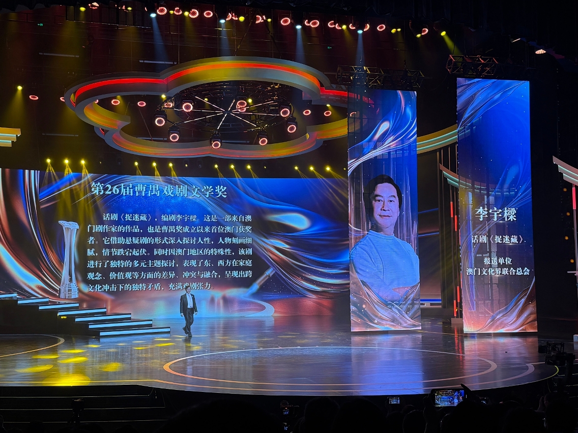 中國戲劇獎‧曹禺劇本獎(曹禺戲劇文學獎)是全國性戲劇文學最高獎項,也是目前唯一的國家級劇作家獎項。由澳門文化界聯合總會推薦的劇作家李宇樑創作的話劇《捉迷藏》成為該獎項45年來首部獲獎的澳門戲劇作品,亦為首次有港澳台地區作品獲得此項榮譽。劇作《捉迷藏》由澳門曉角劇社製作,以精妙的懸疑敘事與細膩的人性刻畫,呈現出澳門戲劇創作兼容中西、深具層次的藝術風貌,呈現出跨文化衝擊下的獨特矛盾,充滿戲劇張力。作品展現出創作者的高度藝術成熟度,以獨特視角為當代華語戲劇注入新鮮視野與敘事可能。