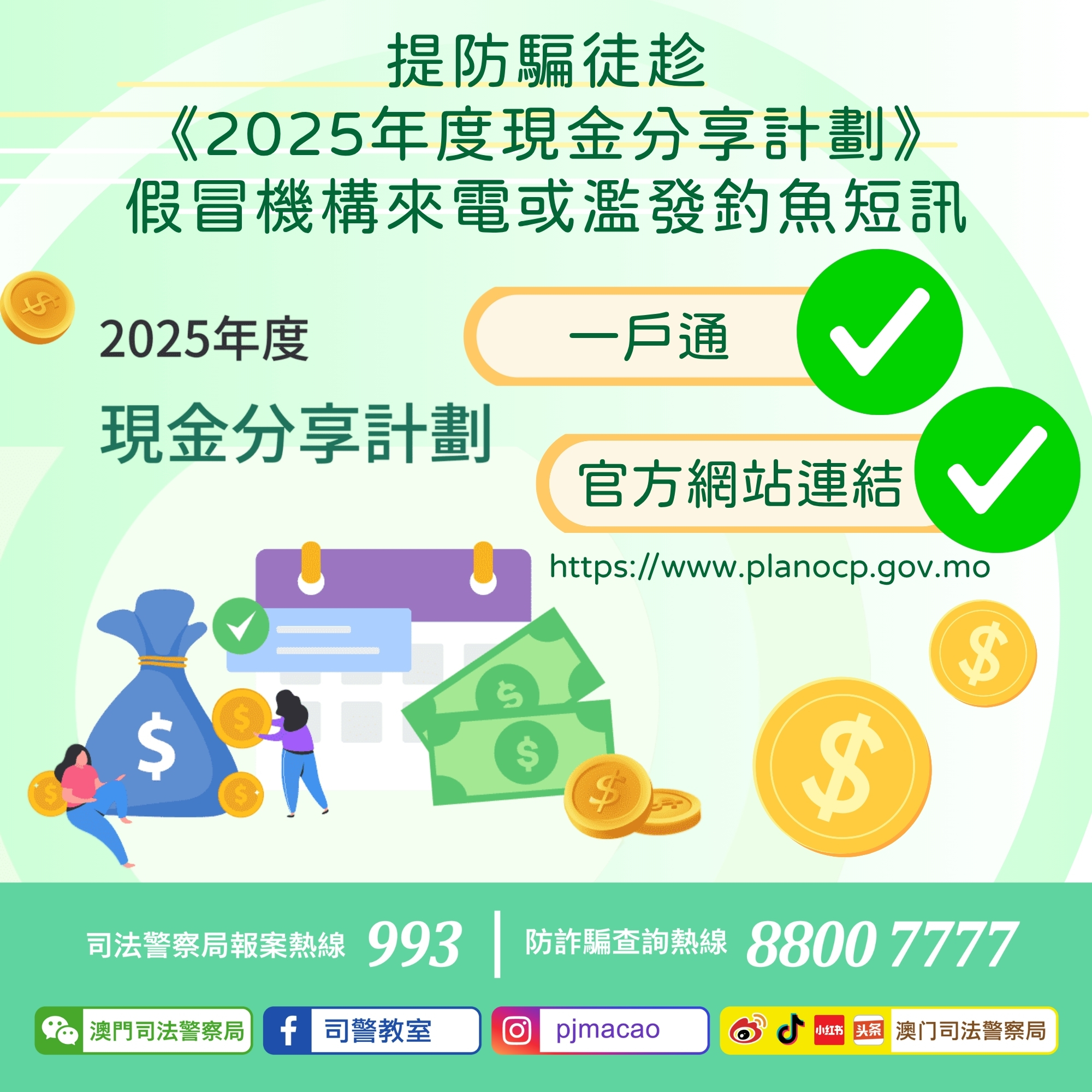 《2025年度現金分享計劃》現已開始,居民可於2025年5月29日下午三時起登入“一戶通”或現金分享計劃網頁(https://www.planocp.gov.mo/)查詢是否符合發放資格。符合發放資格的人士會按照既定的時間表,透過銀行轉帳或支票方式自動收取款項,無需提出申請。