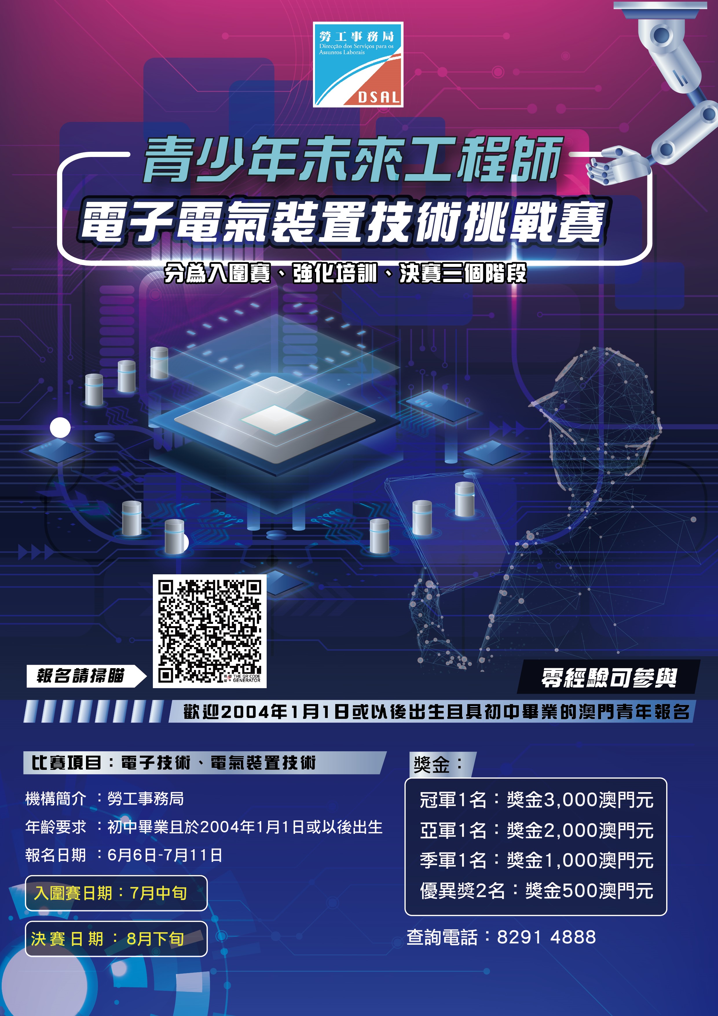 為培養青年對科學技術的興趣,勞工事務局舉辦青少年未來工程師電子電氣裝置技術挑戰賽,報名期由6月6日起至7月11日,歡迎2004年1月1日或以後出生且具初中畢業的澳門居民報名參與。