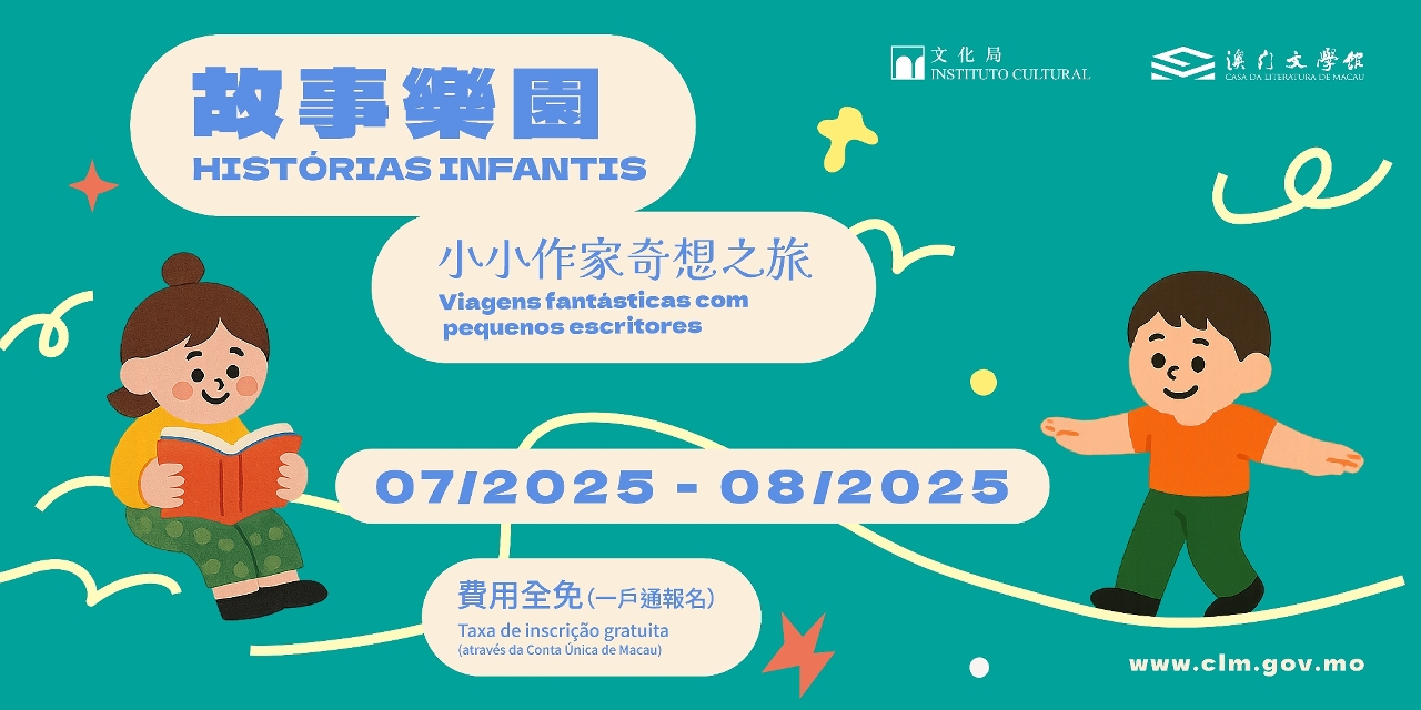 “故事樂園──小小作家奇想之旅”將於7月5日至8月9日期間逢星期六下午3時至5時在澳門文學館舉行,對象為4至7歲的兒童,需由一位家長陪同參與。每場活動以不同的兒童文學故事作為主軸,導師透過生動有趣的方式演繹作品內容,配合趣味小遊戲及互動環節,讓參加者暢遊精彩的故事世界;活動亦設有主題相關寫作練習,在輕鬆愉快的氛圍中啟發孩子的想像力與表達能力,把天馬行空的想法化為文字,與家長一同享受創作樂趣。