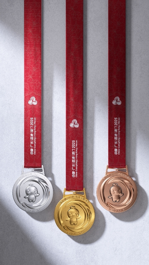 “同心躍”奬牌設計融合粵港澳大灣區發展脈搏、中華文化底蘊與全運歷史傳承。競技體育項目奬牌重354.5克,一面正中上方的會徽由代表粵港澳三地的花瓣交疊扭轉形成同心禮花,下方牡丹花托舉而上,寓意粵港澳大灣區背靠祖國繁榮發展,為民族復興貢獻力量。中間的吉祥物中華白海豚手舉火炬,靈動活潑,周圍浪濤造型的數字“15”巧妙地將全運會屆別與體育精神的傳承完美結合。群眾賽事活動奬牌重232克,一面刻有會徽和運動會名稱,另一面則是吉祥物中華白海豚浮雕及毛澤東同志的題詞“發展體育運動 增強人民體質”,充分彰顯“全民全運,全運惠民”的理念。奬牌邊緣雕刻的66道紋路,象徵著全運會66年的輝煌歷史,掛扣採用港珠澳大橋同心結造型,寓意三地團結一心,奬牌綬帶以“三花映牡丹”為紋樣,突顯粵港澳大灣區的獨特風采。而配套的獲奬證書、牌匾及信封等均延續“三花映牡丹”的視覺體系。