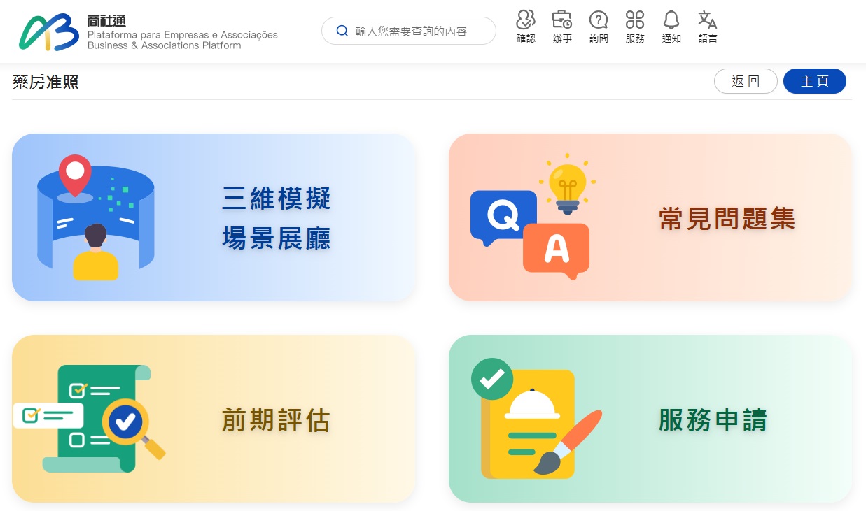 藥監局透過“商社通”平台,聯同行政公職局、土地工務局、消防局、勞工事務局、文化局、專營公司及保險公司,為市民及業界提供全流程電子化的藥房及中藥房准照申請服務,申請人可“零跑動”辦理准照申請相關事務,還可以電子化方式取得審批意見、跟進補遺文件及場所整改,不需再走訪多個部門辦理及跟進事項。