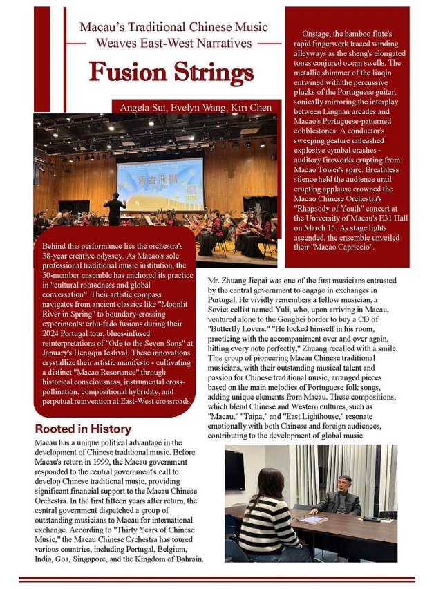 同為澳大社會科學學院傳播系學生的紹邦書院院生陳子祺、馬萬祺羅柏心書院院生隋心怡、曹光彪書院院生王奕心,在該系高級導師謝曉陽指導下作賽;他們以《澳門中樂》為主題,展示澳門中樂的城市印象,獲得大賽文字報道賽道的三等獎。同為澳大社會科學學院傳播系學生及馬萬祺羅柏心書院院生的隋心怡、王彥博,澳大工商管理學院商業智能與數據分析系學生、紹邦書院院生唐浩源,澳大科技學院數學系學生、馬萬祺羅柏心書院院生劉梓霄,在澳大馬萬祺羅柏心書院導師陳耀揚指導下作賽;他們以《第三只眼看澳門》為主題,以外國友人的視角,展示澳門自“一國兩制”實行以來社會安全的繁榮盛景,獲得大賽音視頻作品賽道的三等獎。得到兩個獎項的隋心怡表示,大賽讓她了解到全國高校學生的優秀傳播作品,認識到在今後的創作中應保持國際視野,講好中國故事。