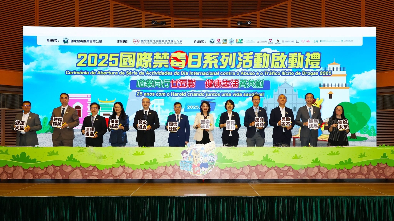 為響應聯合國將每年6月26日訂為國際禁毒日,由國家禁毒委員會辦公室指導,澳門特別行政區政府社會工作局主辦,廣東省禁毒委員會辦公室、香港特別行政區政府保安局禁毒處、澳門基督教青年會、澳門科學館、以及多個政府部門和民間機構合辦的“2025國際禁毒日系列活動”,於6月14日下午假澳門科學館會議中心會議廳舉行啟動禮。由澳門特區政府社會工作局代局長許華寶、中央人民政府駐澳門特別行政區聯絡辦公室社會工作部副部長趙河清、國家公安部禁毒局二級巡視員馬艷春、廣東省公安廳禁毒總隊政委鄭志強、香港特區政府保安局禁毒處禁毒專員李基舜、橫琴粵澳深度合作區民生事務局局長馮方丹、澳門特區政府藥物監督管理局局長蔡炳祥、警察總局局長助理梁文照、司法警察局毒品罪案調查處處長李家和、澳門科學館館長邵漢彬、澳門基督教新生命團契總幹事劉展瑞及澳門基督教青年會副總幹事岑慧儀主持啟動儀式,禁毒委員會、政府部門、學校、防治濫藥協作機構共超過200人出席,活動同步設有線上直播。
