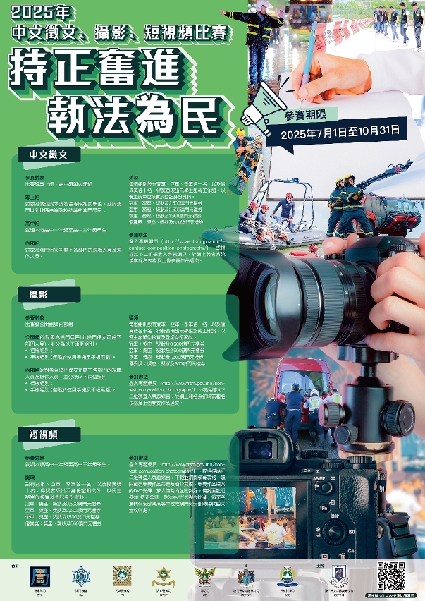 為傳揚澳門保安部隊及保安部門人員秉持正直奮進的精神履行職責、執法為民,展示積極向上的警隊文化。澳門保安部隊及保安部門今年續舉辦中文徵文和攝影比賽,並新增設短視頻比賽,三項比賽均以“持正奮進 執法為民”為主題,呈現澳門保安部隊及保安部門人員在現今複雜多變的社會環境下,堅守正直無私、奮勇前進的信念,秉公執法為民。上述比賽於2025年7月1日至10月31期間接受報名,歡迎踴躍參加。