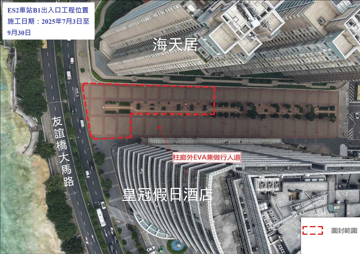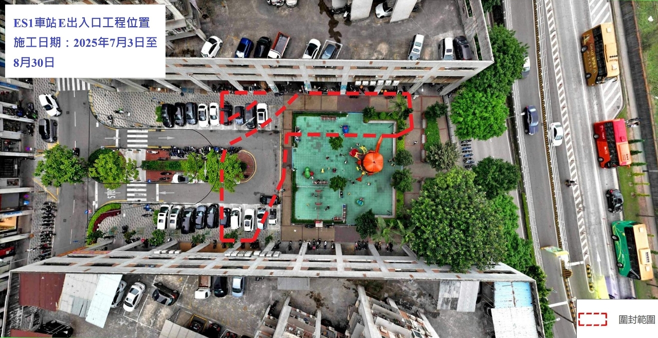 是次三個出入口工程分別是位於勞動節街的ES2站A1出入口(見圖1)、位於東方明珠街的ES2站B1出入口(見圖2)以及位於如意廣場的ES1站E出入口(見圖3),將自7月起分階段施工。首階段會進行管線遷移、地下管線鋪設、重整行車道及依照市政署指引及要求對合適的樹木進行遷移等。配合施工,7月3日至12月31日,如意廣場、友誼橋大馬路與黑沙環中街之間的一段勞動節街實施有限度通車,如意廣場及勞動節街部份咪錶泊車位暫停使用;7月14日至12月31日,勞動節街近黑沙環中街的電單車泊車位暫停使用;而工程範圍之休憩區則暫停開放。