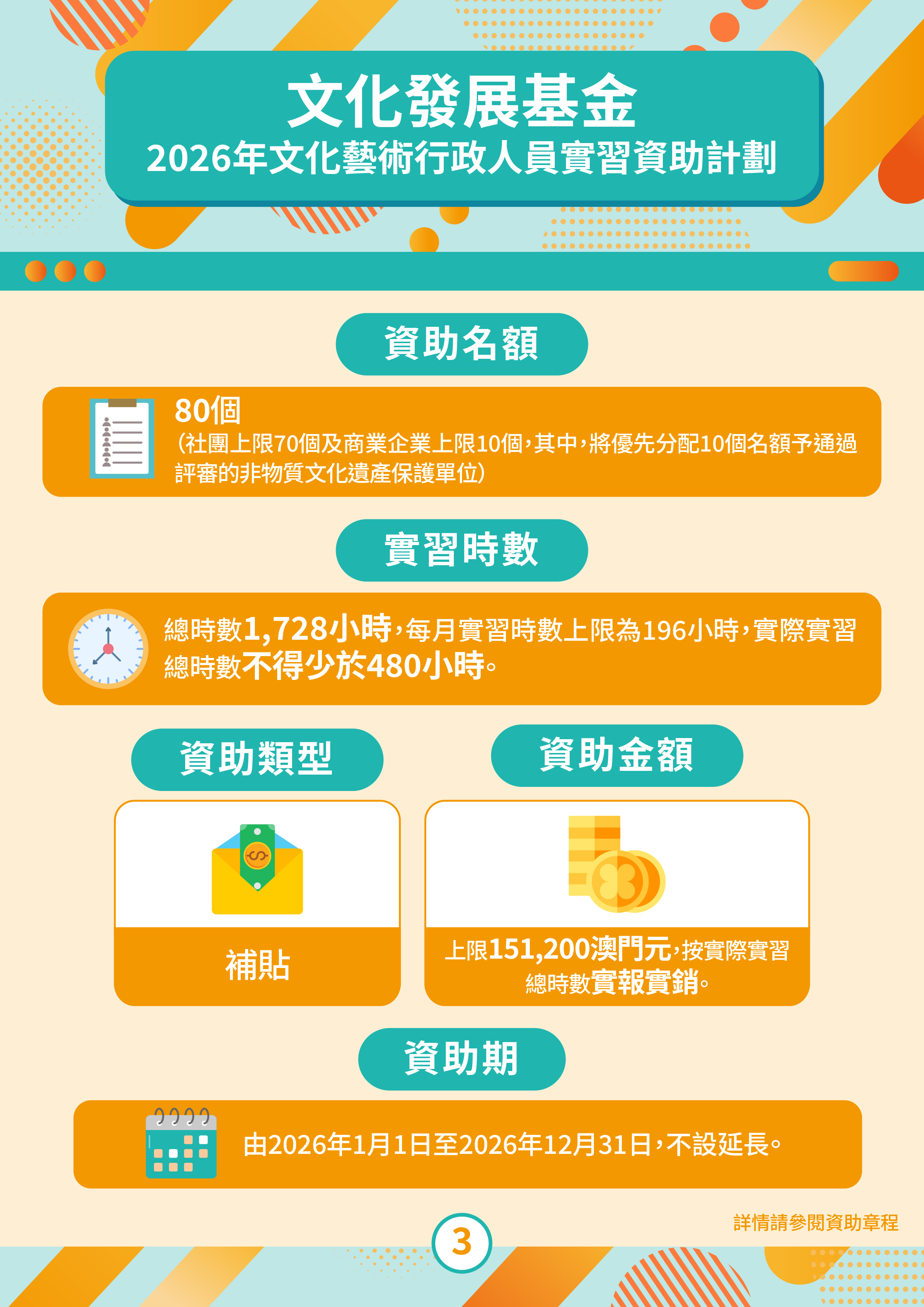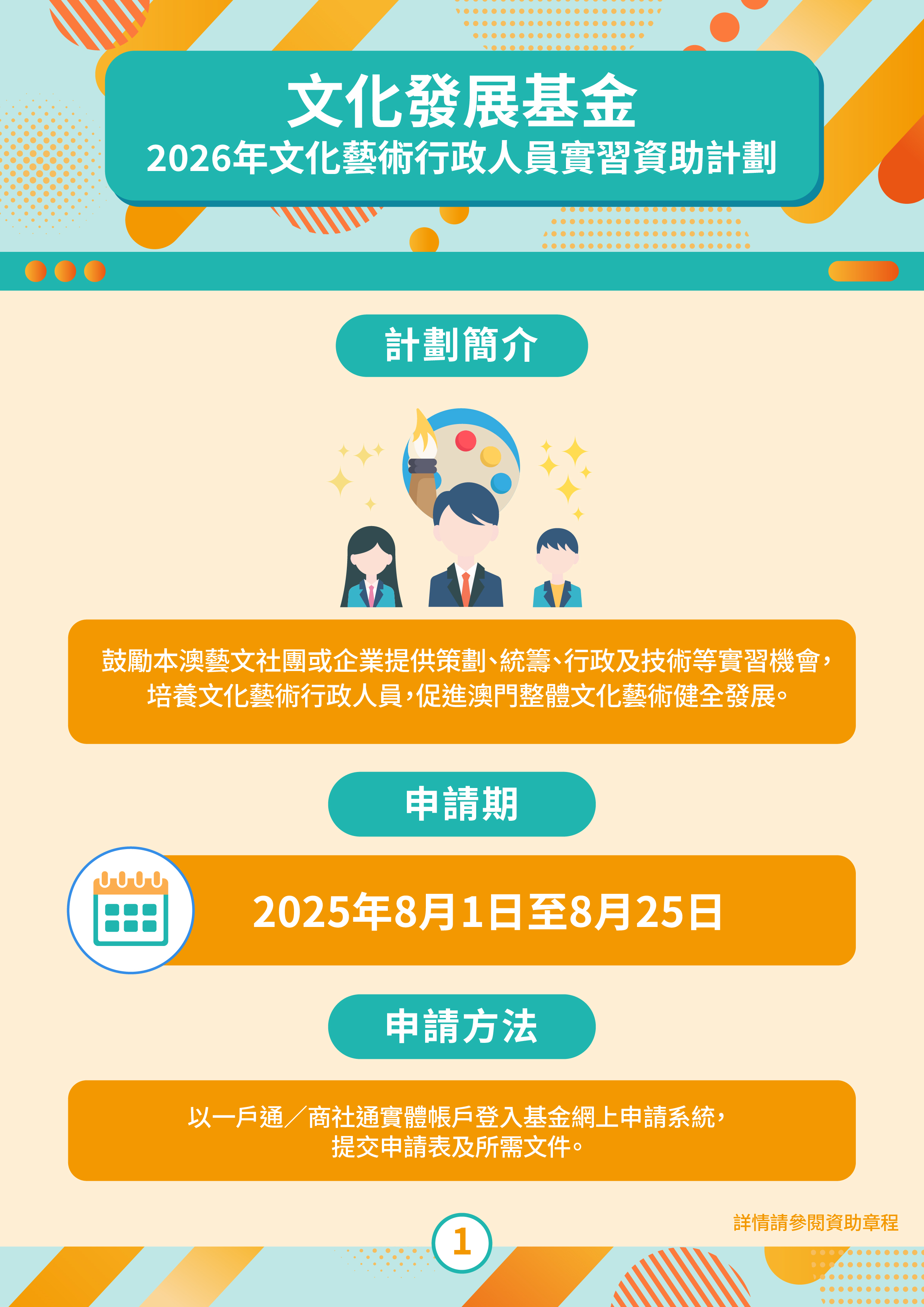 文化發展基金於8月1日至8月25日接受“文化藝術行政人員實習資助計劃”的申請,鼓勵本澳文化藝術社團或商業企業通過參與此項計劃,提供有關文化藝術活動策劃、統籌、行政及技術等實習機會,為本澳培養文化藝術範疇行政人員,從而促進澳門整體文化藝術的健全發展。