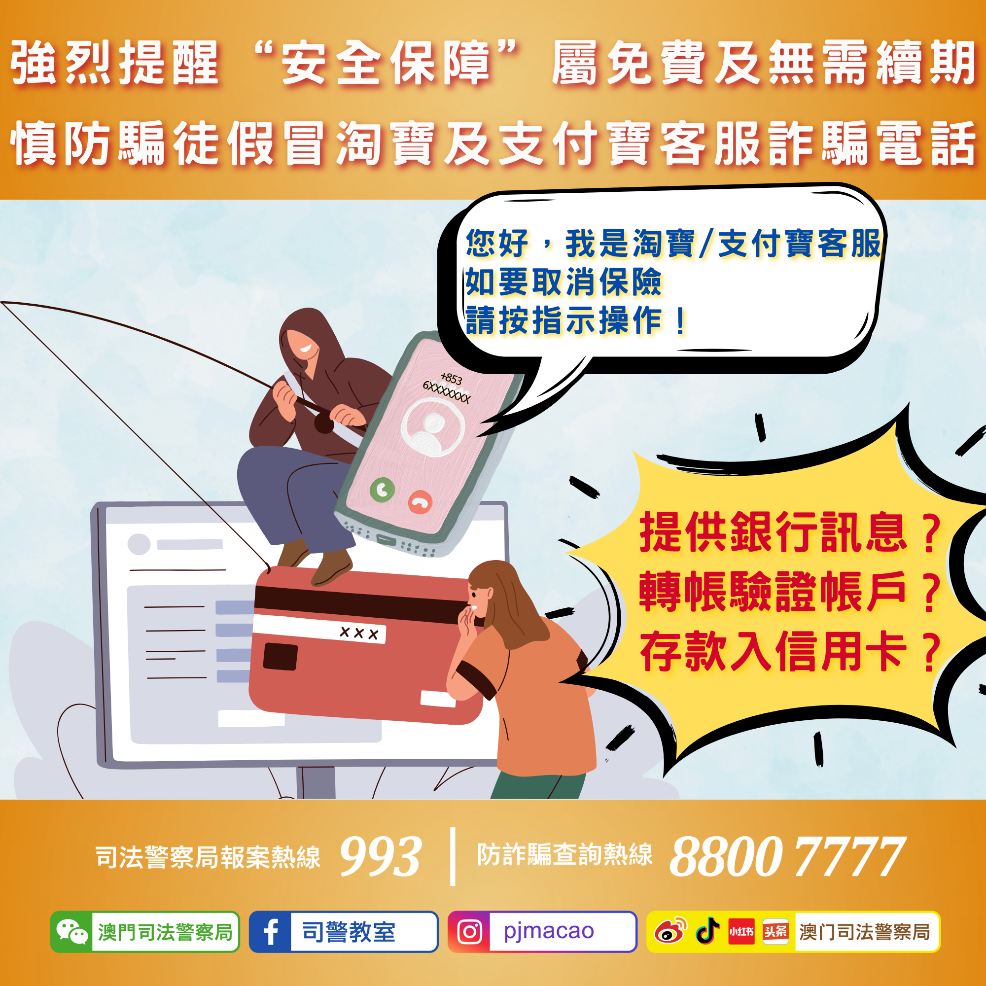 根據案情顯示,騙徒會以“+853”開首的流動電話號碼致電事主並使用普通話自稱“淘寶”、“支付寶”客服人員,訛稱事主的“資金安全保障”、“支付安全保障”到期,要求事主配合其指示進行操作以取消該保險服務,否則將會收取高額費用,包括提供銀行賬戶及信用卡資料、下載APP進行手機同屏、轉賬至指定戶口進行驗證等。
