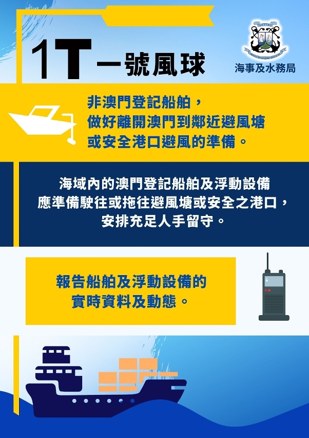 隨著熱帶氣旋進一步靠近,本澳天氣可能逐漸轉差,尤其三號風球時會有大量船隻駛入內港錨地避風,業界應及早做好避風安排。工程船在三號風球時必須撤離施工區域,漁船亦應及早回澳避風,預留充足回航時間,確保船隻安全和繫穩繩纜,嚴防因惡劣天氣及風暴潮造成的安全威脅或貨物損失。如有需要,海事及水務局也會按照內港臨時防洪措施預警通報機制,通知內港碼頭的聯絡人安裝防水旱閘。