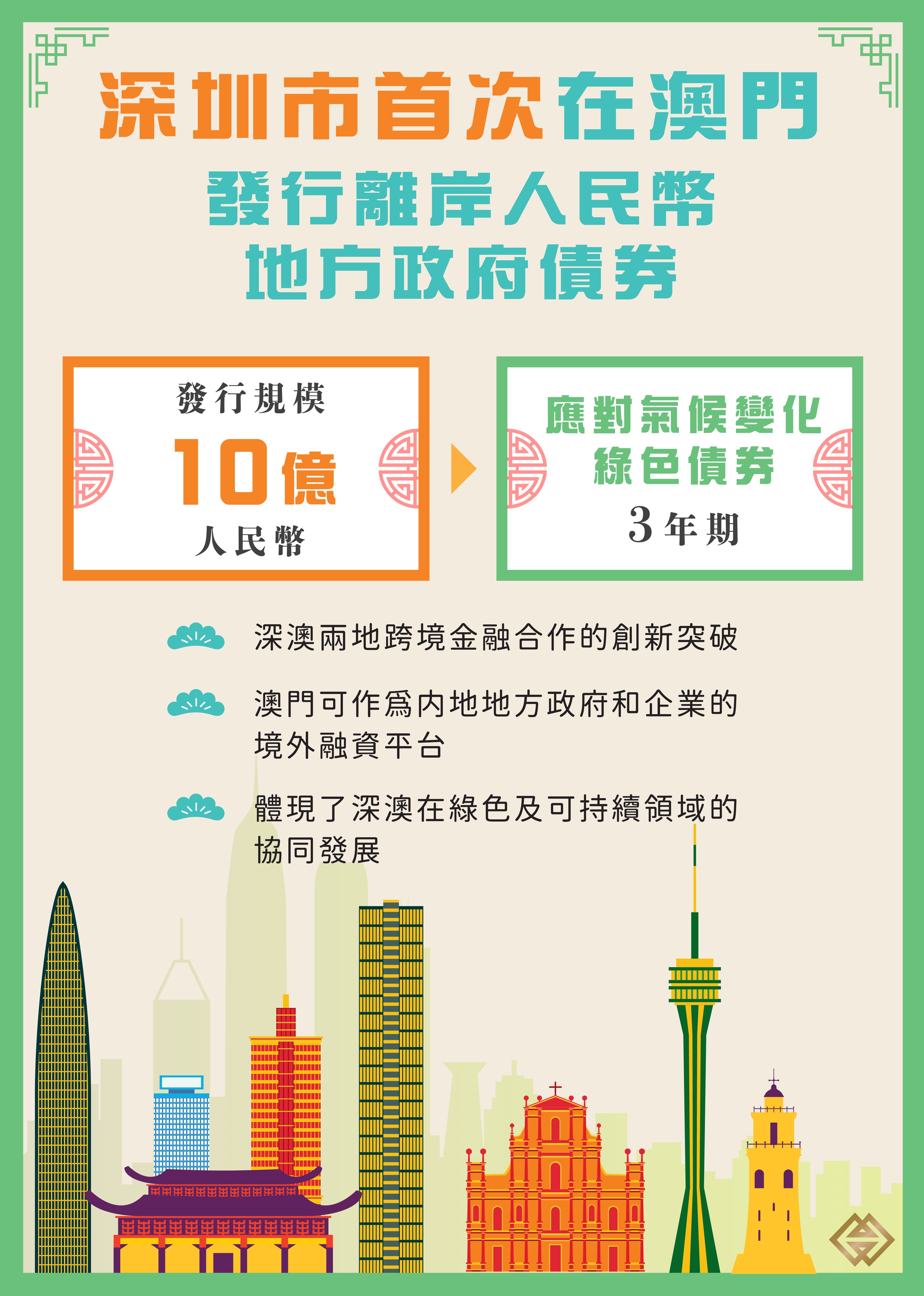 深圳市人民政府今(9)日成功在澳門特別行政區發行10億元人民幣(下同)地方政府債券,是深圳市首次在澳門發行離岸人民幣地方政府債券,也是首次在澳門發行以應對氣候變化為主題的綠色債券。澳門金融管理局對債券的成功發行致以祝賀,並感謝國家財政部、深圳市人民政府對澳門發展新金融業態的支持。