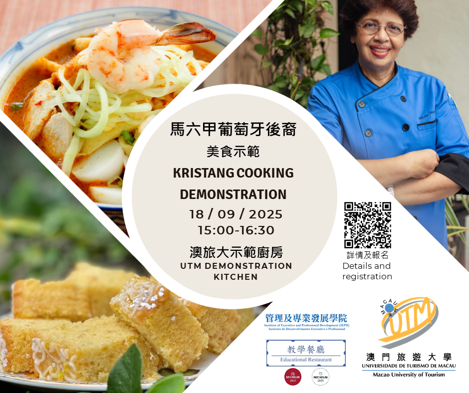 除此之外,澳旅大管理及專業發展學院將與教學餐廳聯袂舉辦 “馬六甲葡萄牙後裔美食名廚大師技藝展示"活動。主廚Melba Nunis將於9月18日15:00至16:30親臨示範廚房,為公眾及業界人士帶來精彩展示。她還會於9月19日的同一時段為澳旅大師生舉行專場展示。此次活動全程以英語進行,並提供粵語傳譯,展示結束後設有問答環節。