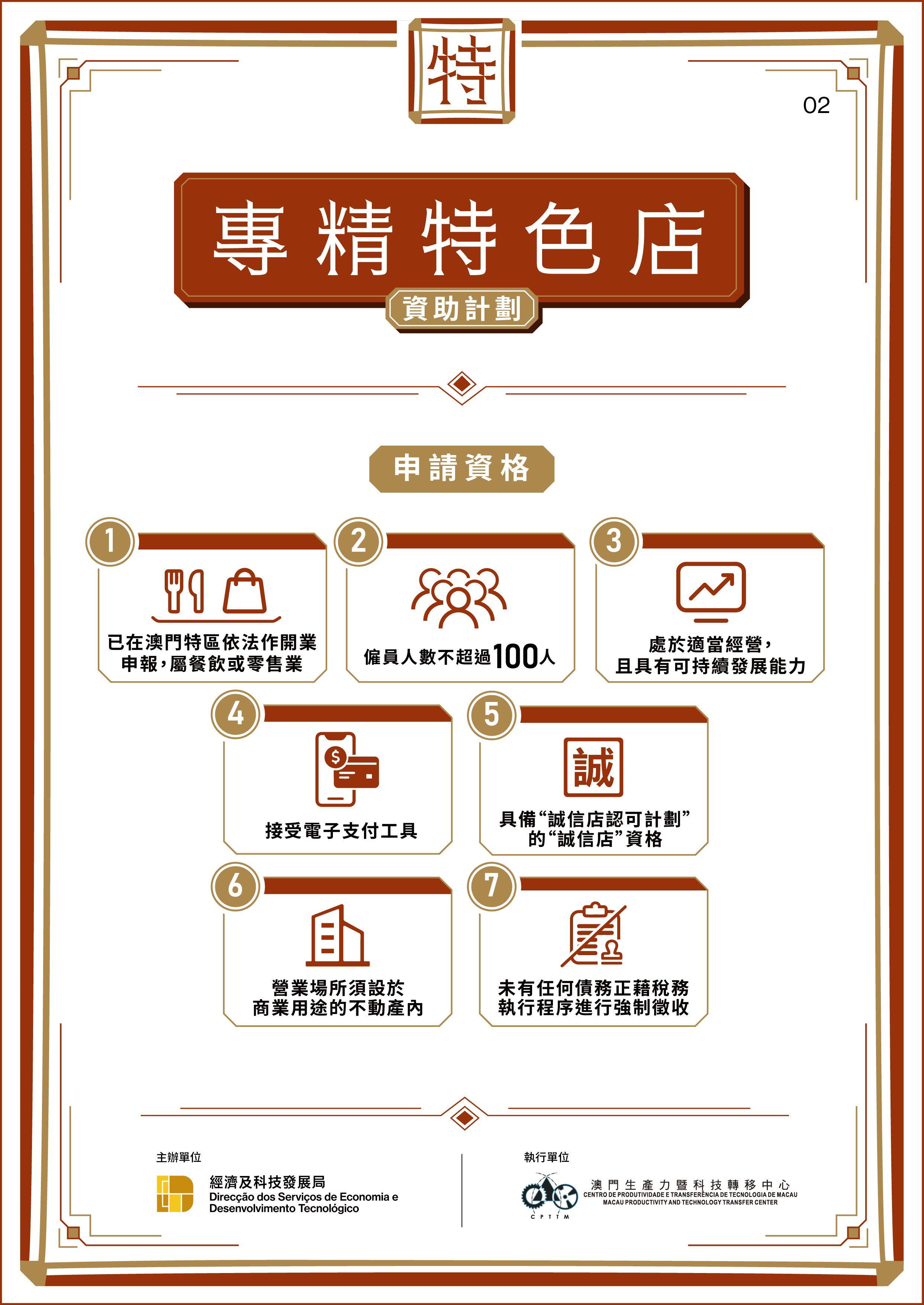 獲評定為“專精特色店”的中小企業,可獲資助實施線上營銷、打造特色店面,以及推出IP聯乘商品相關指定費用的六成資助,上限15萬澳門元。此外,執行單位將為“專精特色店”提供一對一專業顧問指導,並對其商業計劃書及經營方案進行診斷及改良。