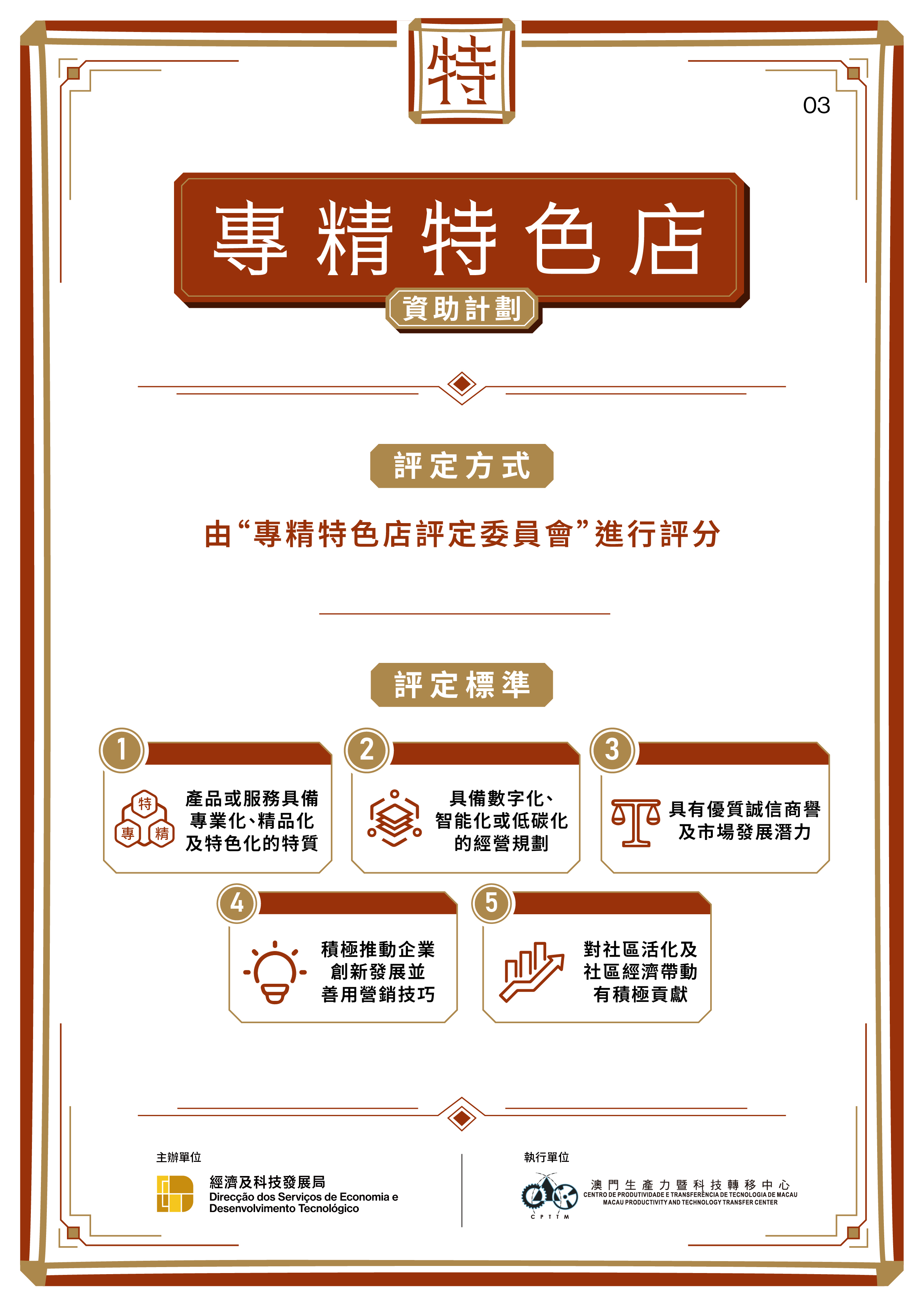 為推動本澳中小企業走向專業化、精品化及特色化發展,發掘更多兼具特色技藝與匠心品質的中小商戶,助力中小企提質升級並增強市場競爭力,工商業發展基金推出《專精特色店資助計劃》,並支持行業商會開展“澳門特色老店”和“百年傳承店”的評定活動。經濟及科技發展局(下稱“經科局”)聯同生產力暨科技轉移中心及澳門連鎖加盟商會,今(16)日舉行發佈會,介紹相關計劃及活動詳情。