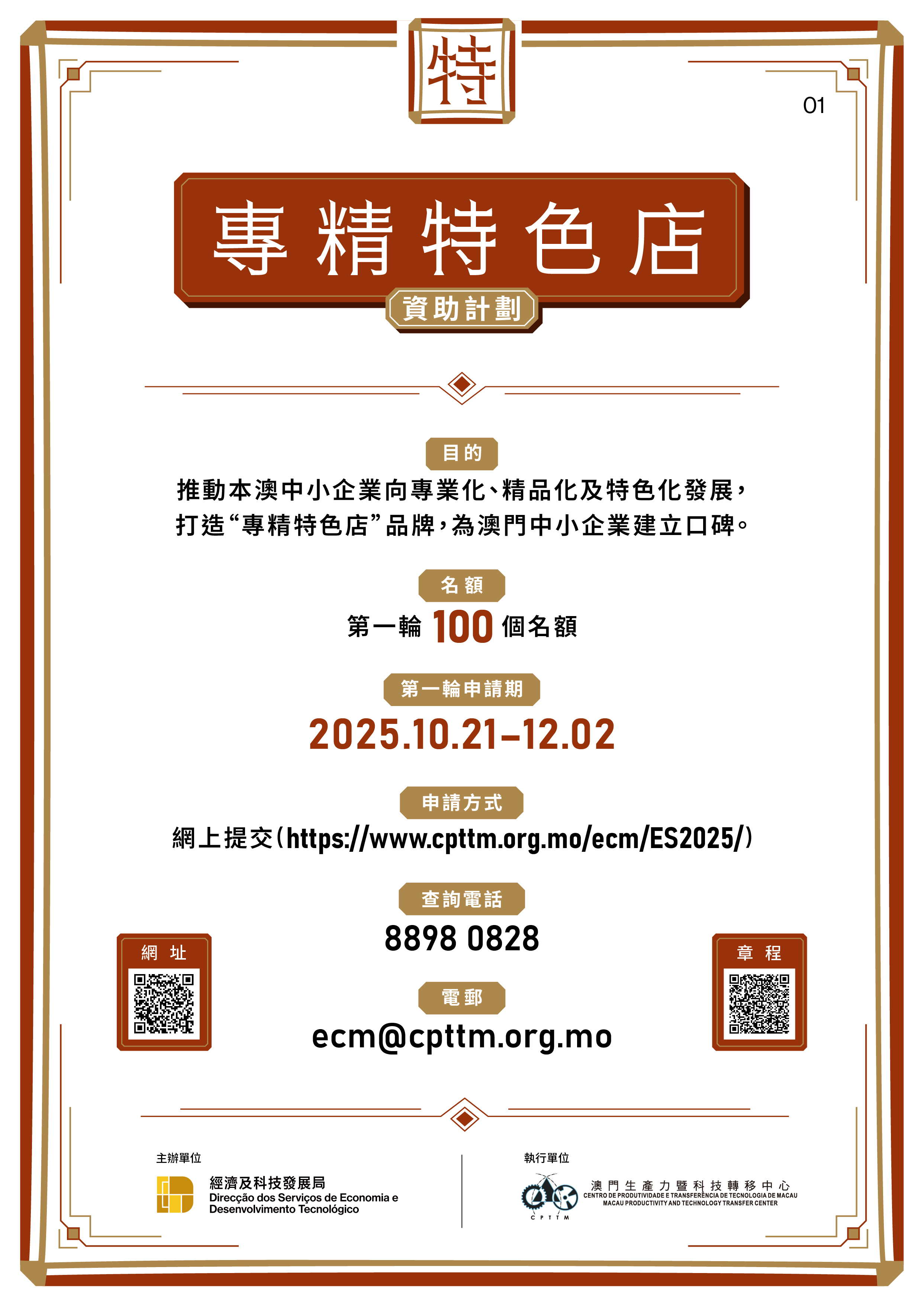 資助計劃的詳情可向澳門生產力暨科技轉移中心查詢,電話:8898 0828,電郵:ecm@cpttm.org.mo。