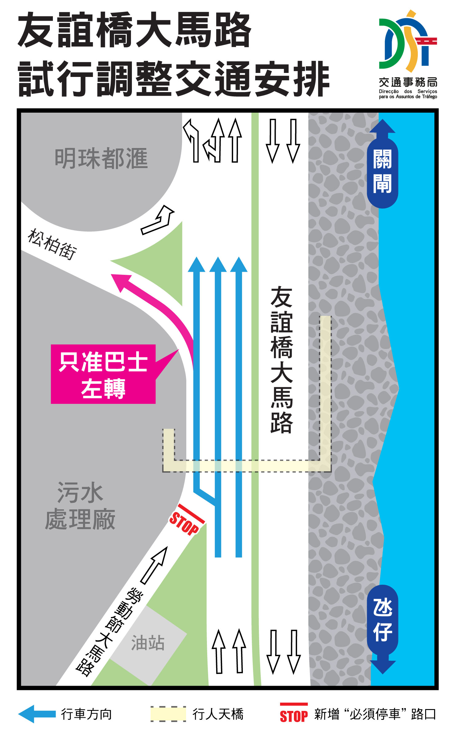 配合黑沙環新填海區P地段內松柏街的開通,為保障行車安全和順理交通,交通事務局經檢視和評估路況,以及聽取交諮委的意見,試行調整該區部分道路的行車安排。當中,為降低勞動節大馬路與友誼橋大馬路交界的車流衝突,友誼橋大馬路的車輛禁止左轉進入松柏街(公共巴士除外);而由勞動節大馬路往友誼橋大馬路方向的路口增設“必須停車”的安排,並加設俗稱“STOP”標誌及標線。