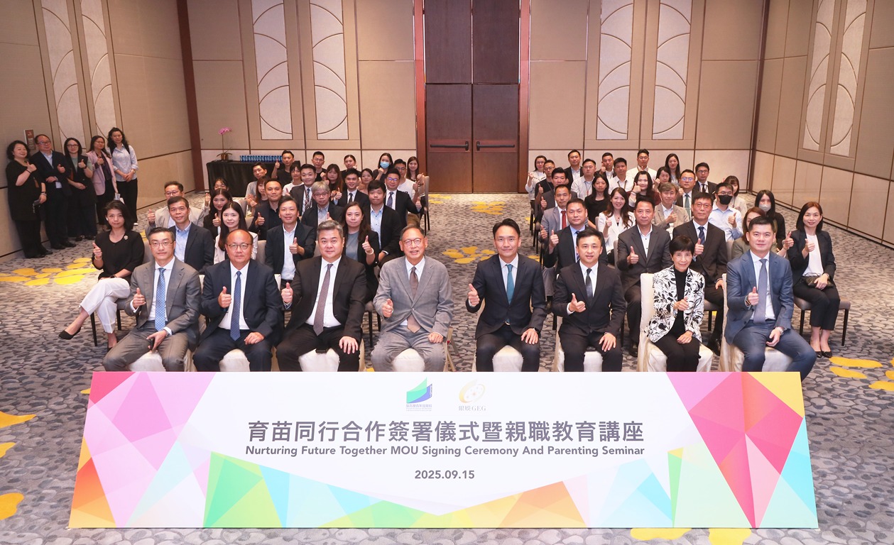 教青局局長龔志明和銀河娛樂集團董事程裕昇於2025年9月15日簽署“育苗同行”合作意向書,透過企業積極推動親職教育工作,協助開展各類家長教育及親子教育活動,讓其員工認識教養子女的技巧,加強對家庭教育的重視,提升家庭幸福感。