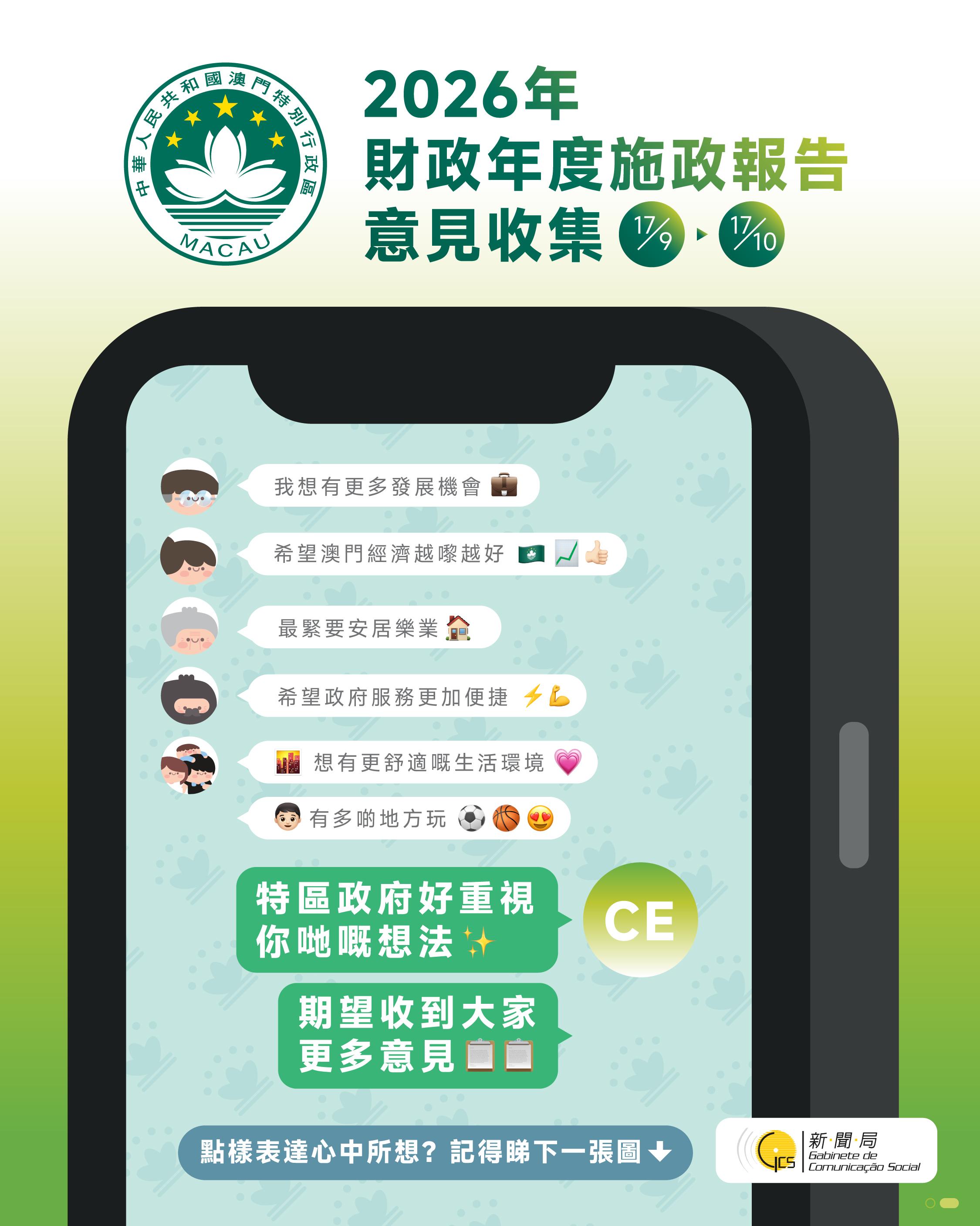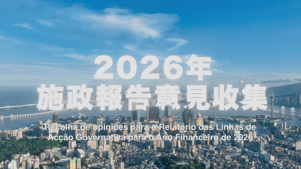 澳門特別行政區政府正制訂《2026年財政年度施政報告》,為在報告編製過程中廣納社會各界意見、凝聚社會共識,特區政府將於9月17日(明日)至10月17日展開為期一個月的施政報告意見收集工作。