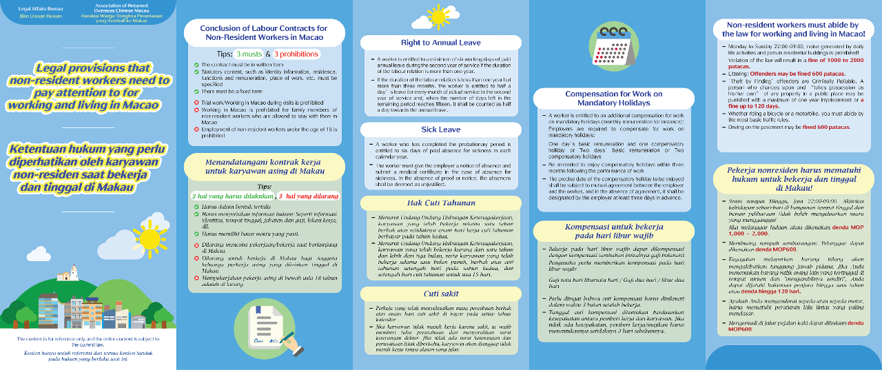 講座由法務局代表主講,並由澳門歸僑總會代表提供印尼語的即時傳譯,內容聚焦外地僱員在澳門工作及生活所需注意的法律規範,包括《勞動關係法》、《公共地方總規章》、《預防和控制環境噪音》、《道路交通法》 等法規,旨在幫助外地僱員了解自身的權利與義務,以及違法行為的相應法律責任等。