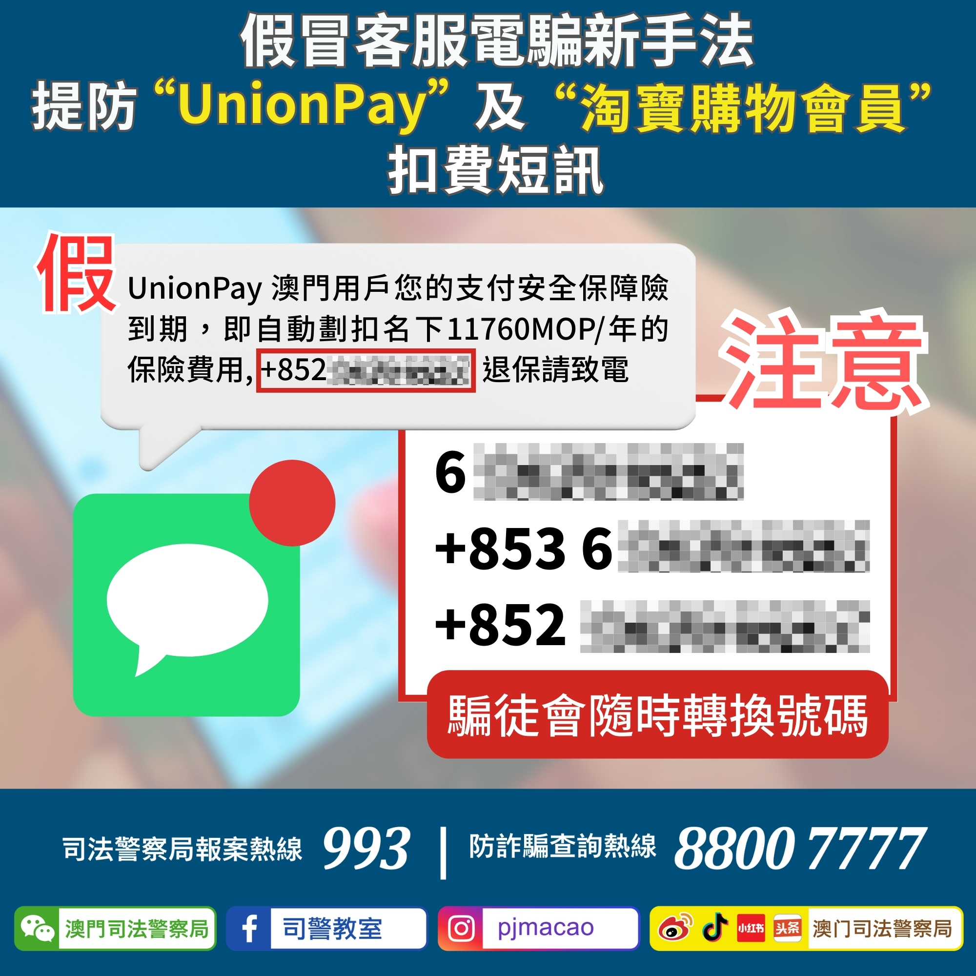 今年本澳出現的假冒客服電話詐騙,騙徒不斷變換假冒的對象(如微信、支付寶)及行騙的方式(主動致電聯絡市民、發送詐騙短訊要求市民致電),為此司警局早前已發出多次警情通告,呼籲大眾小心提防。而近日再發現騙徒變更行騙劇本及涉詐短訊內容,包括假冒“UnionPay”訛稱支付安全保障免費到期、假冒“Alipay”訛稱“淘寶購物會員正在付款”等,並著市民致電短訊內所載的電話號碼以辦理退款。當電話接通後,騙徒將會誘騙市民提供銀行賬戶及信用卡資料、下載應用程式進行手機同屏、登入假冒金融機構的釣魚網站,或直接要求轉賬至騙徒指定戶口。