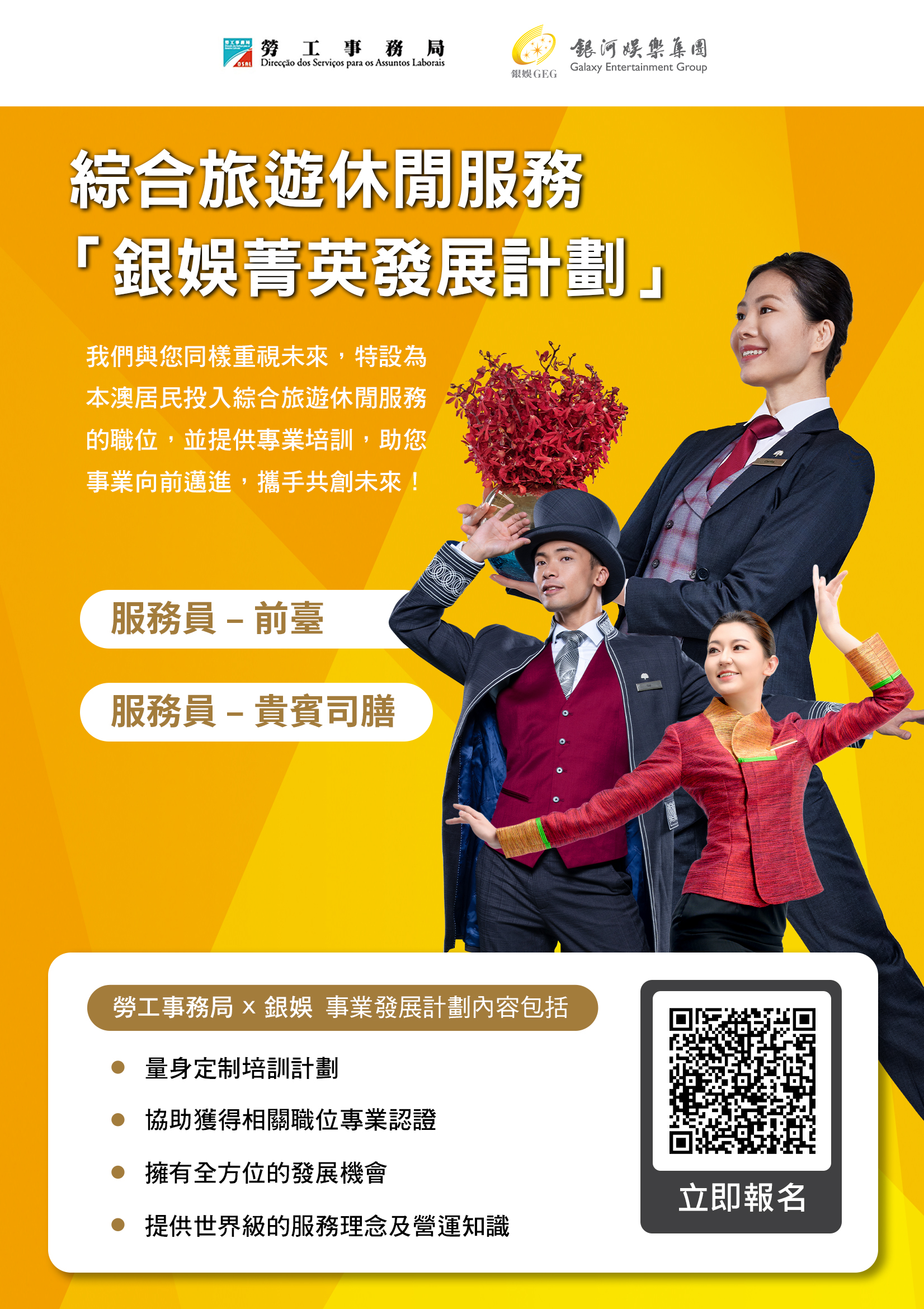 為支持本地人才全面發展,拓展多元職涯路向,勞工事務局(下稱勞工局)和銀河娛樂集團(下稱銀娛)合作推出“銀娛菁英發展計劃(酒店營運)"(下稱計劃),以“先入職、後培訓"方式,為有志投身酒店營運的澳門居民,提供全方位的培訓及事業發展機會,計劃由9月19日起接受申請。