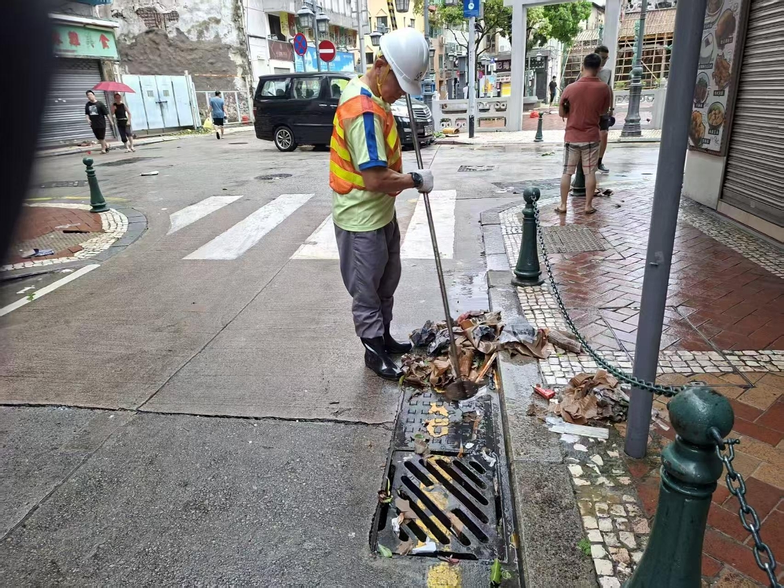在八號風球懸掛期間,市政署在安全情況下,持續派員清理沖積渠口的垃圾及路邊雜物,避免雜物垃圾阻塞渠口影響排水,以保持渠道暢通。