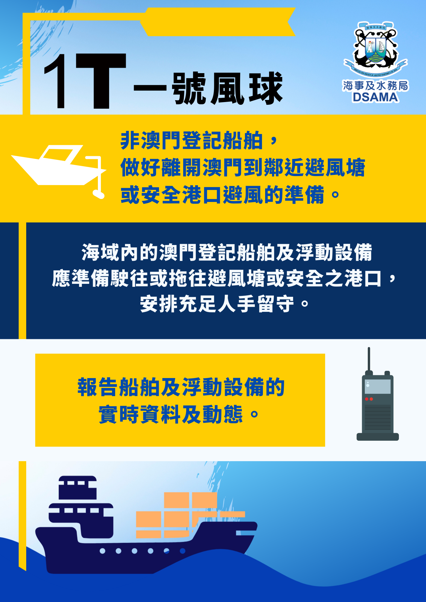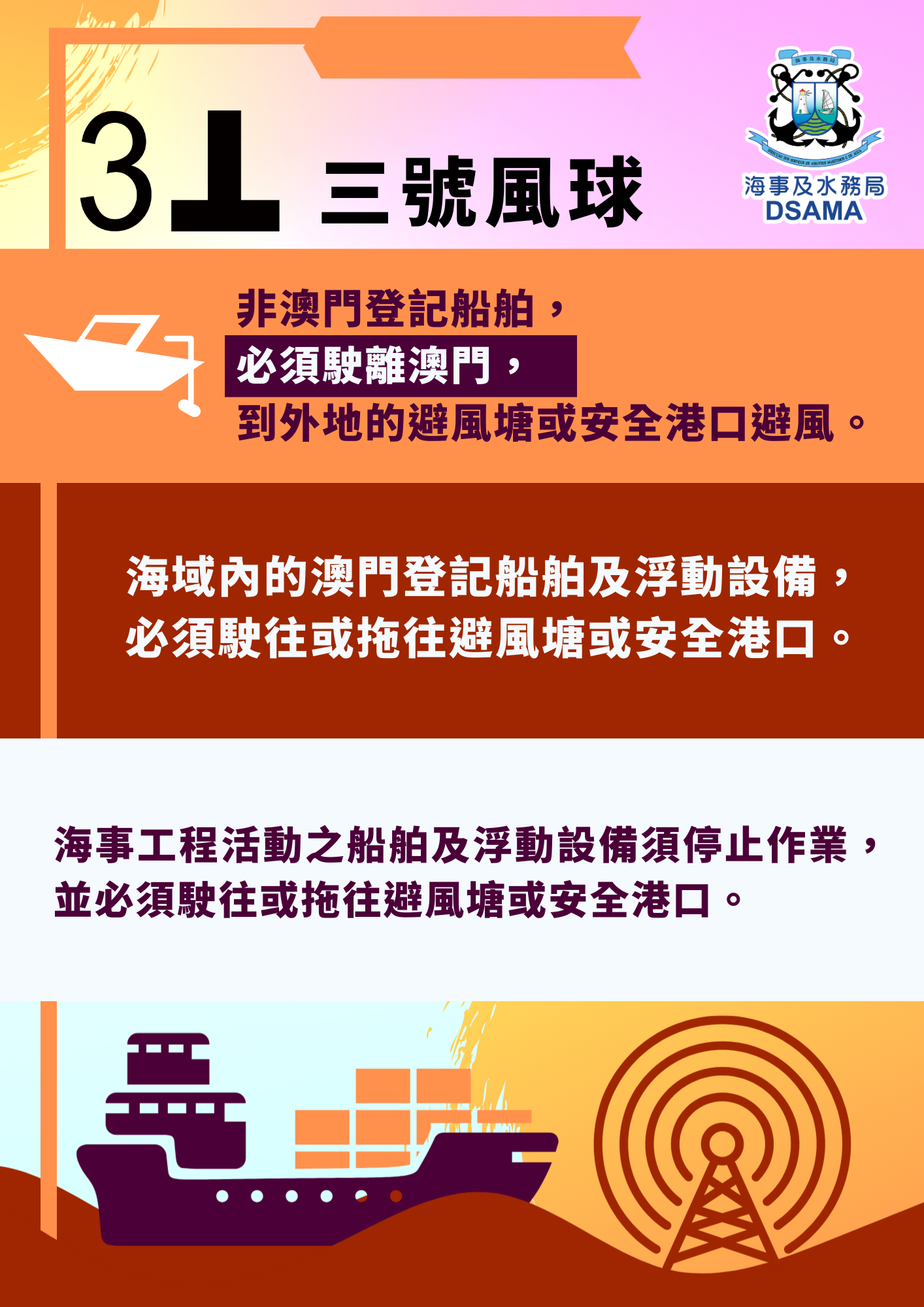隨著熱帶氣旋進一步靠近,本澳天氣可能逐漸轉差,尤其三號風球時會有大量船隻駛入內港錨地避風,業界應及早做好避風安排。工程船在三號風球時必須撤離施工區域,漁船亦應及早回澳避風,預留充足回航時間,確保船隻安全和繫穩繩纜,嚴防因惡劣天氣及風暴潮造成的安全威脅或貨物損失。如有需要,海事及水務局也會按照內港臨時防洪措施預警通報機制,通知內港碼頭的聯絡人安裝防水旱閘。