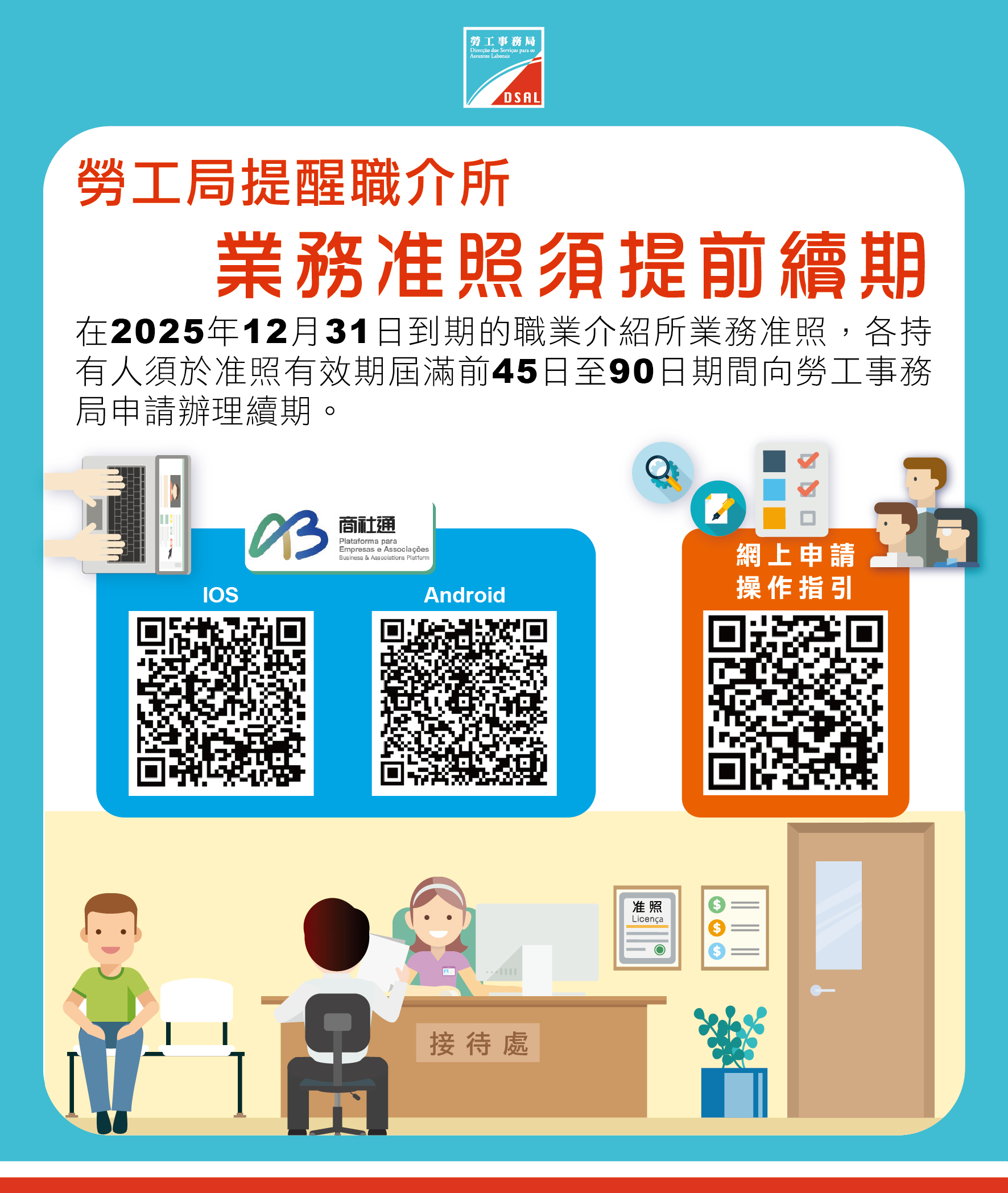 按照第16/2020號法律《職業介紹所業務法》規定,在2025年12月31日到期的職業介紹所業務准照,各持有人須於准照有效期屆滿前45日至90日期間(即2025年10月3日起)向勞工事務局申請辦理續期。倘少於45日前提出,須額外繳付多1倍續期費用;另倘有效期屆滿前仍未提出,准照會被註銷。因此,准照持有人務必於法定期間內提出續期申請及提交所需的申請文件。續期方式可掃瞄二維碼下載商社通手機應用程式網上提交或以紙本提出申請。