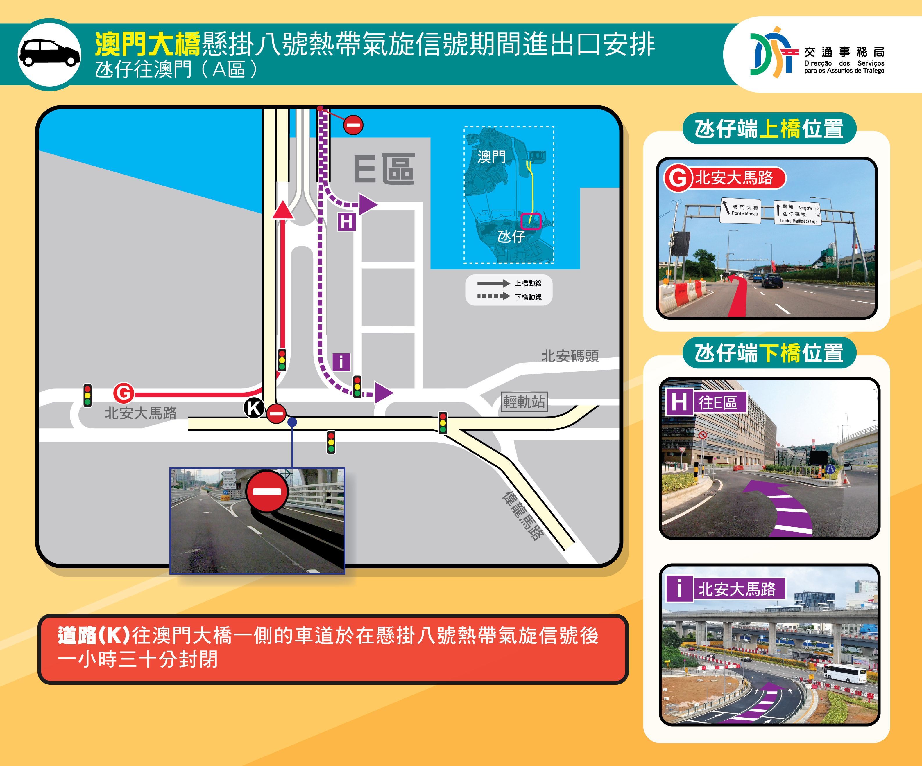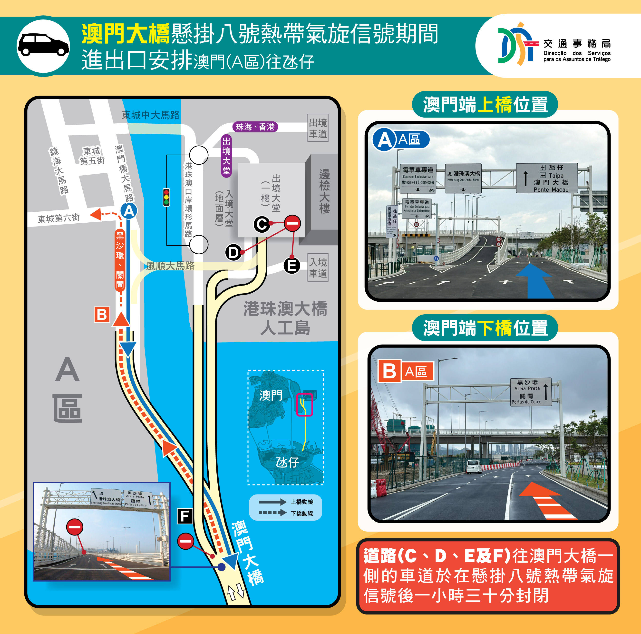 • 澳門大橋在懸掛八號熱帶氣旋信號期間的進出口安排 – 氹仔往澳門(a區)