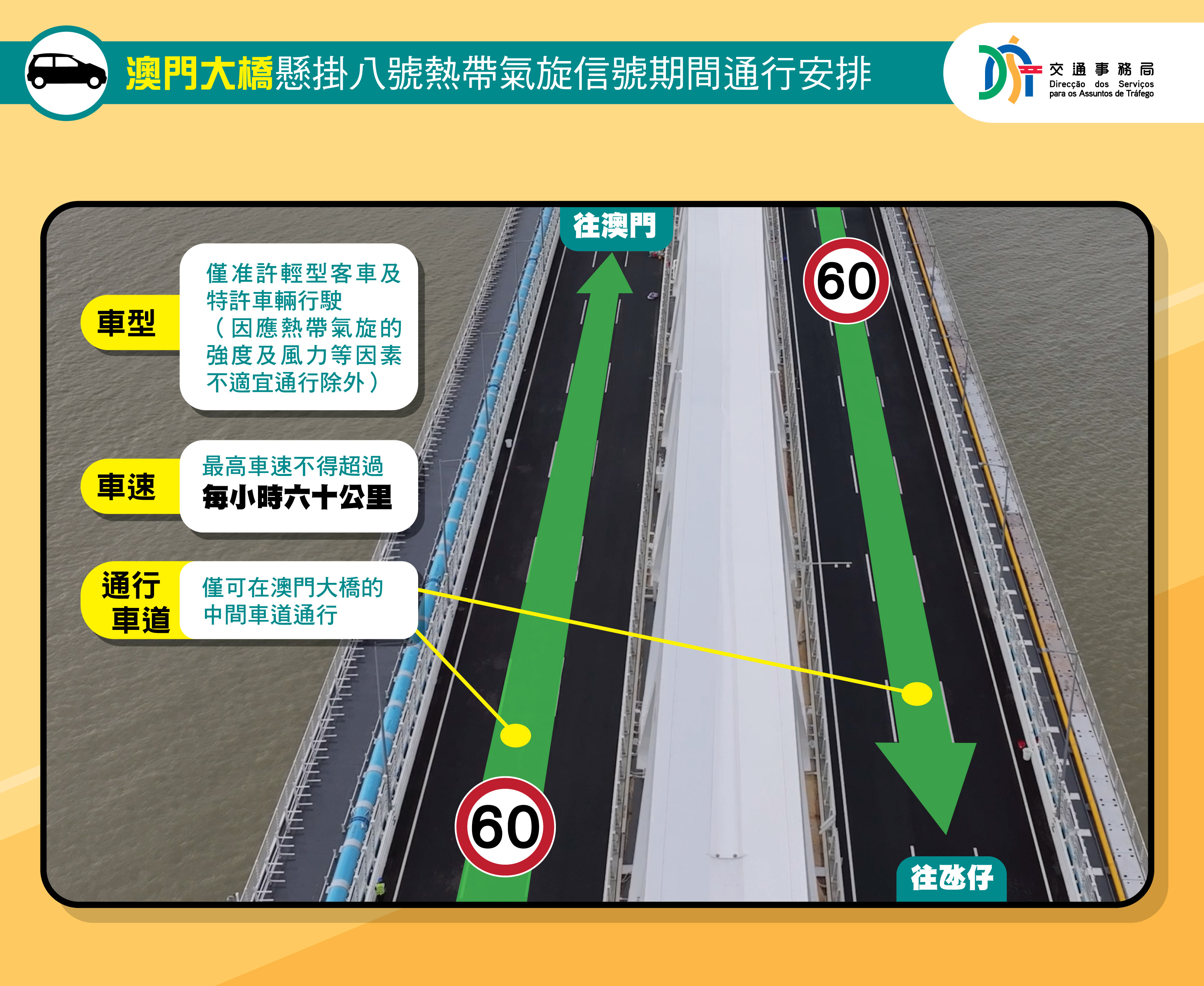 • 澳門大橋在懸掛八號熱帶氣旋信號期間的進出口安排 – 澳門(a區)往氹仔